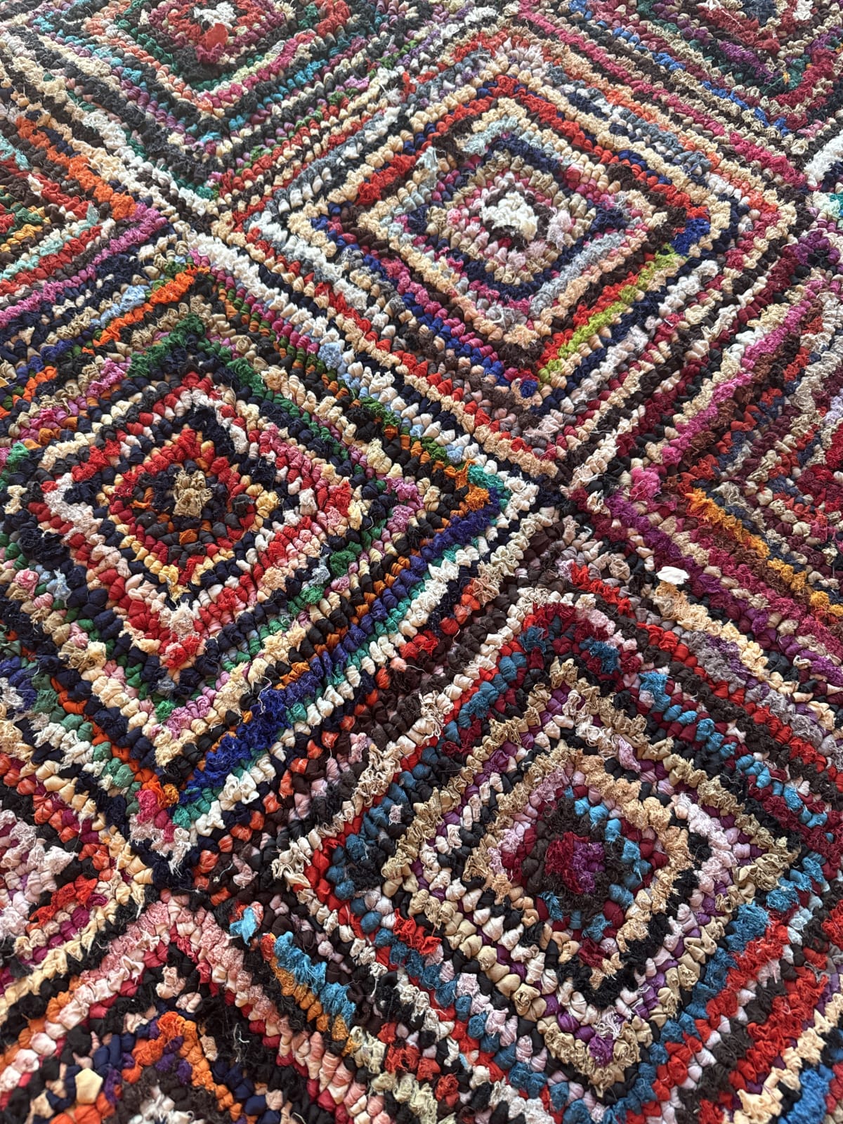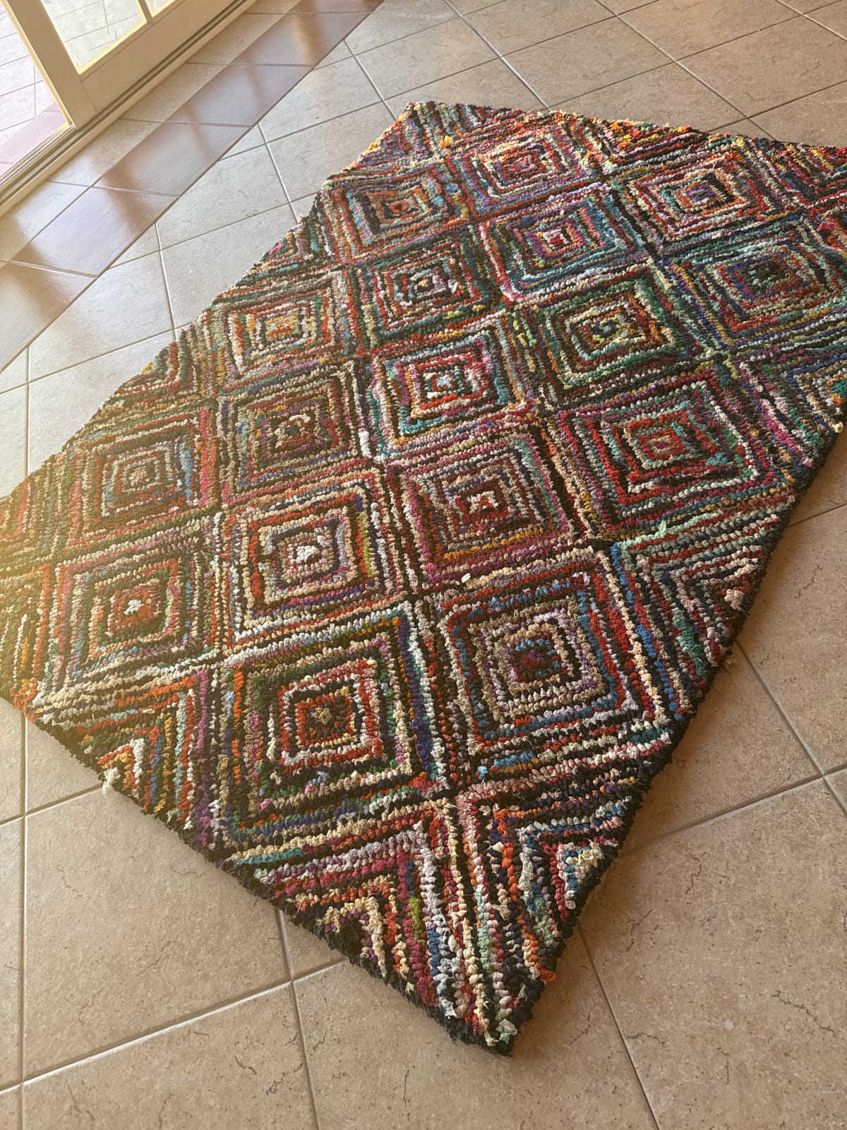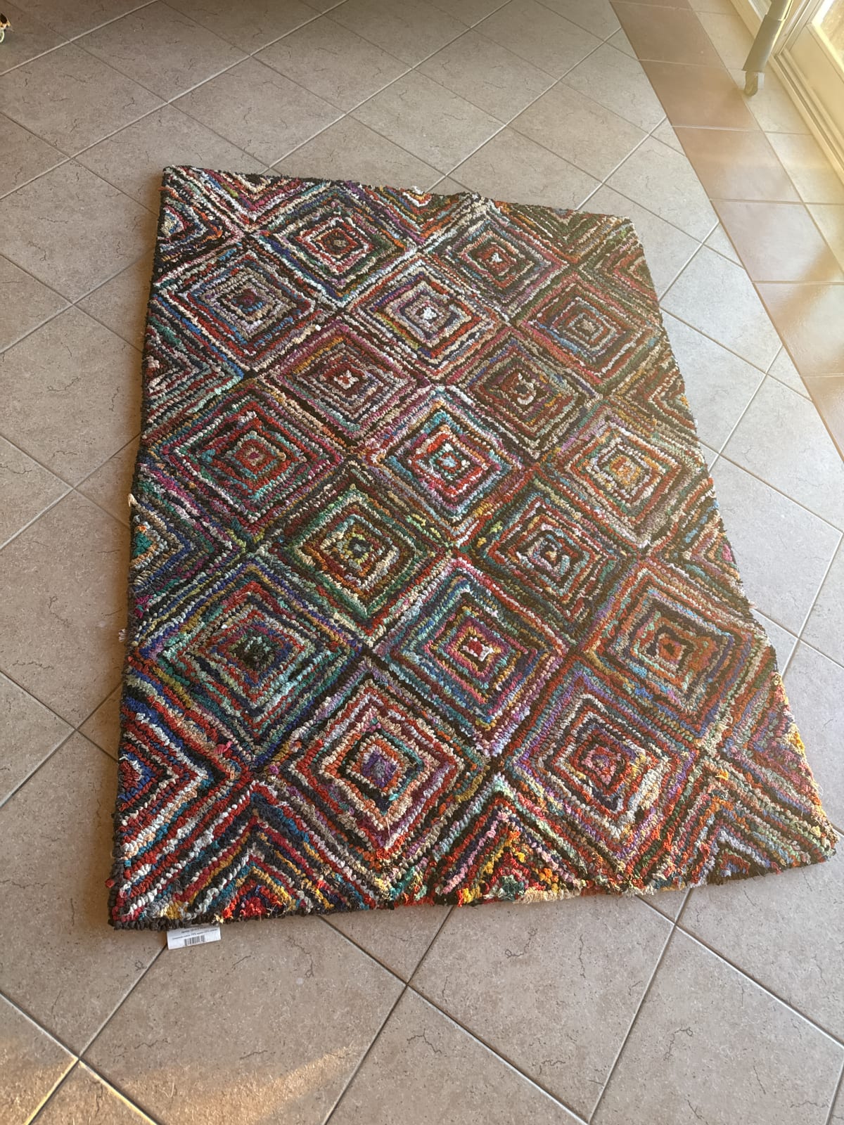 Alfombra de diseño geométrico en tonos vibrantes. Se encuentra en buen estado, con un tejido resistente y colores que aportan vida a cualquier espacio. Ideal para sala o comedor. No presenta manchas visibles, pero tiene ligeras señales de uso.