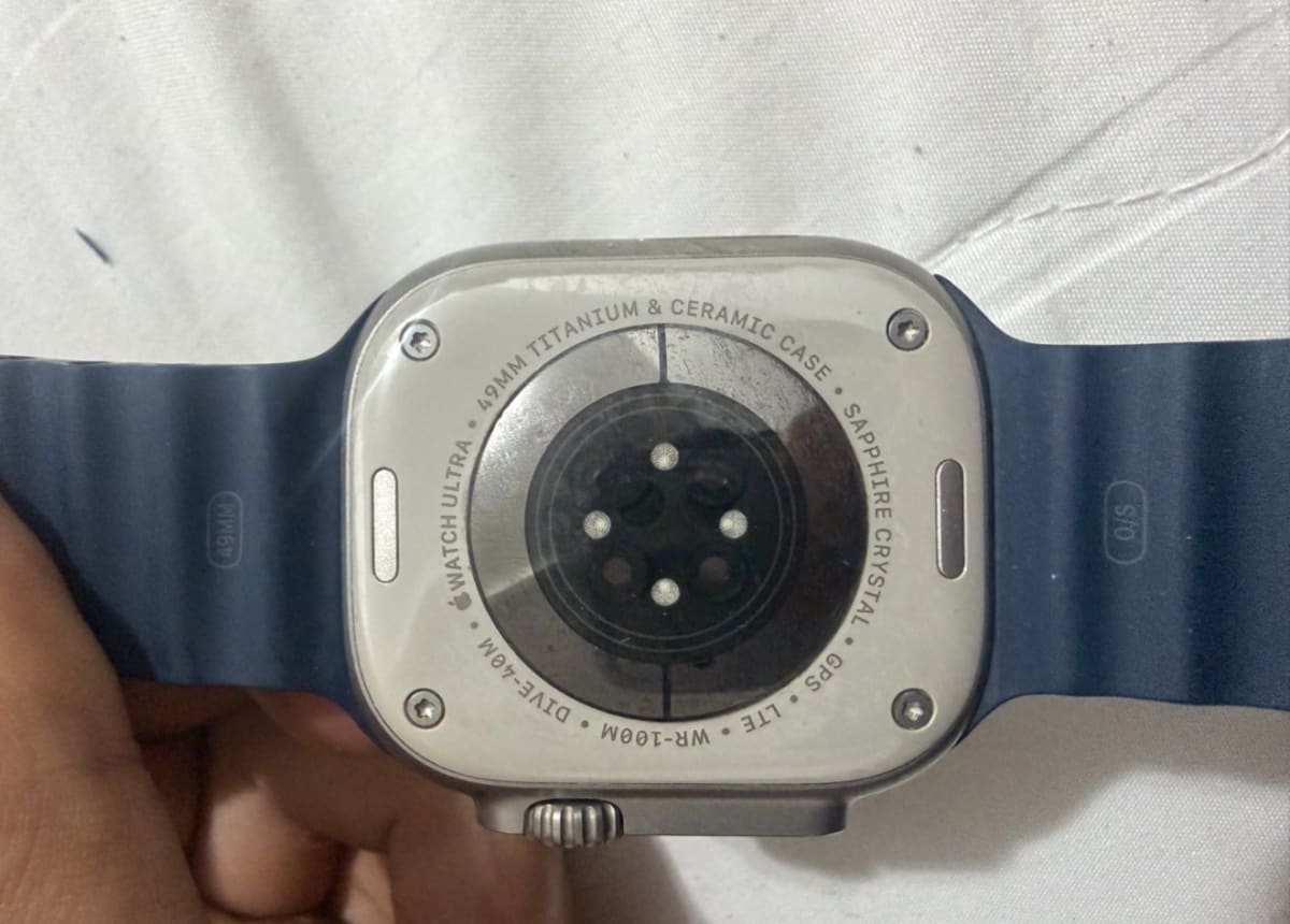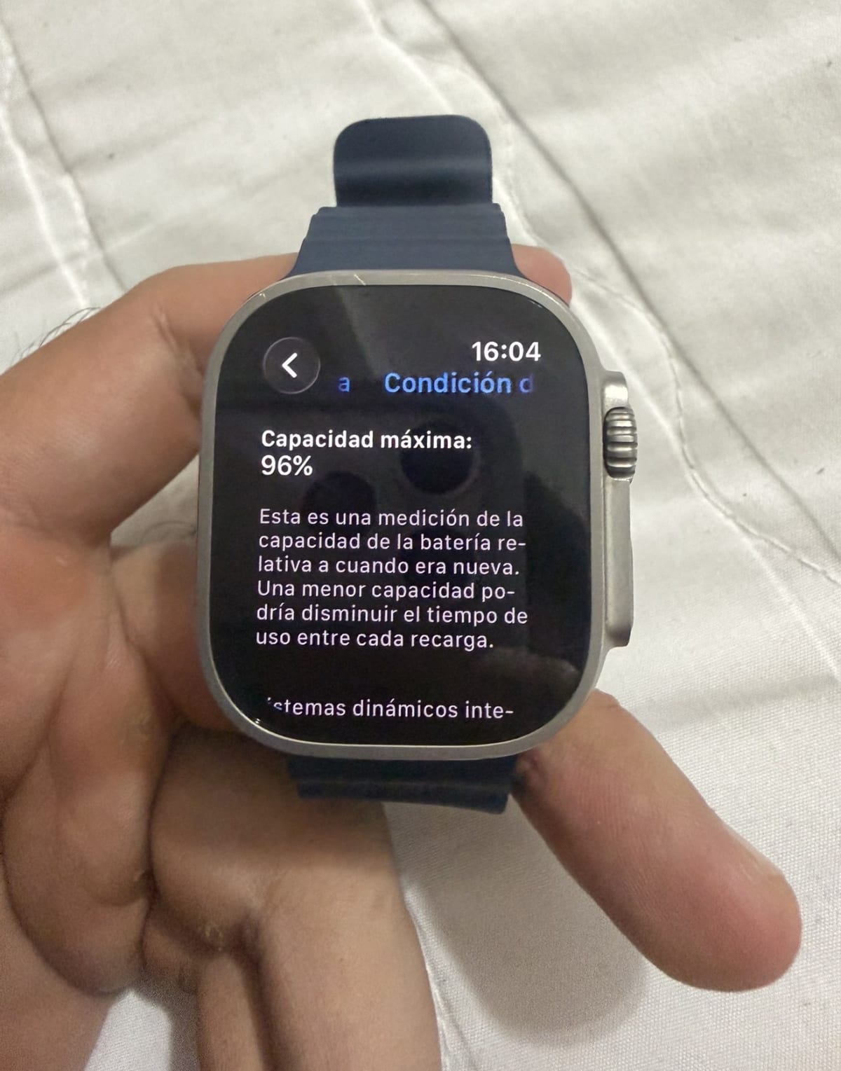 Vendo Apple Watch Ultra 2 de 49mm en buen estado. La batería tiene una capacidad máxima del 96%, lo que indica un buen rendimiento. Incluye correa original de color azul