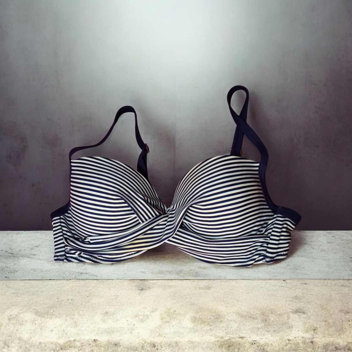 Conjunto de bikini en color azul marino con rayas blancas. El sujetador tiene copas con relleno y tirantes ajustables, mientras que la parte inferior cuenta con lazos laterales. En buen estado, sin defectos visibles. Ideal para disfrutar del verano. Solo tiene una pequeña mancha por estar guardado