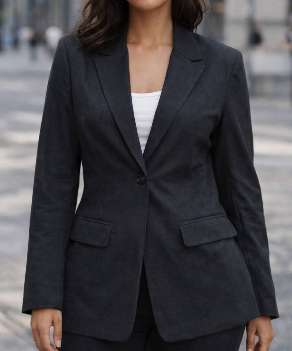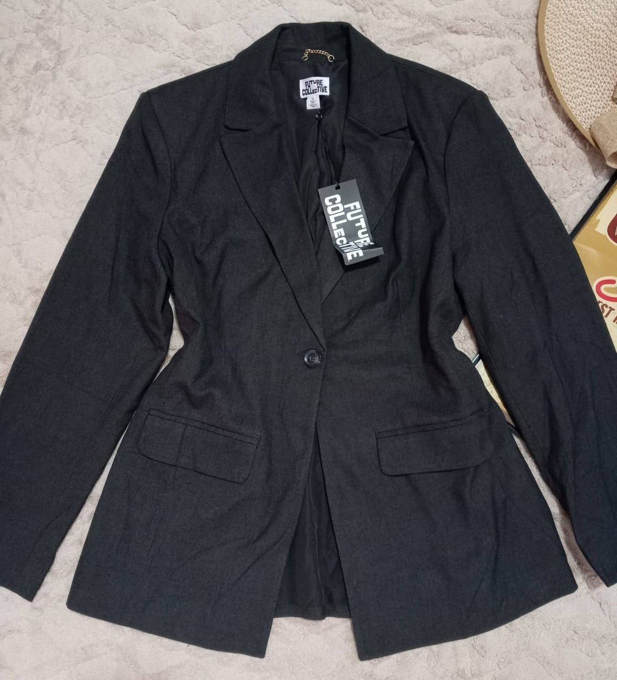 Blazer negro de mujer en excelente estado, de la marca Future Collective. Tiene un diseño clásico con dos bolsillos frontales y un botón de cierre. Incluye etiqueta original, lo que indica que no ha sido usado. Ideal para ocasiones formales o de oficina.