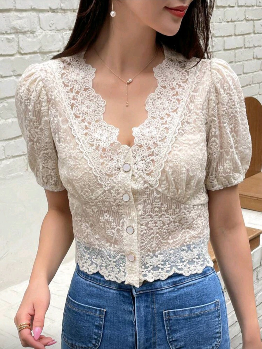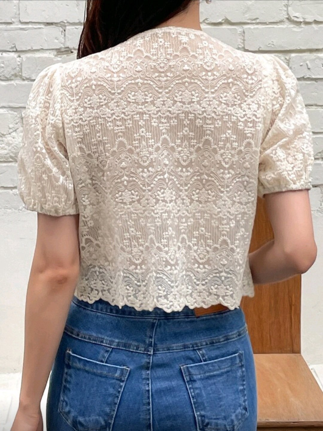 Blusa de encaje manga corta Talla M (Dice XL pero viene reducida a M) Color Albaricoque Estado Usado como nuevo 🎁 +top bandeau talla M