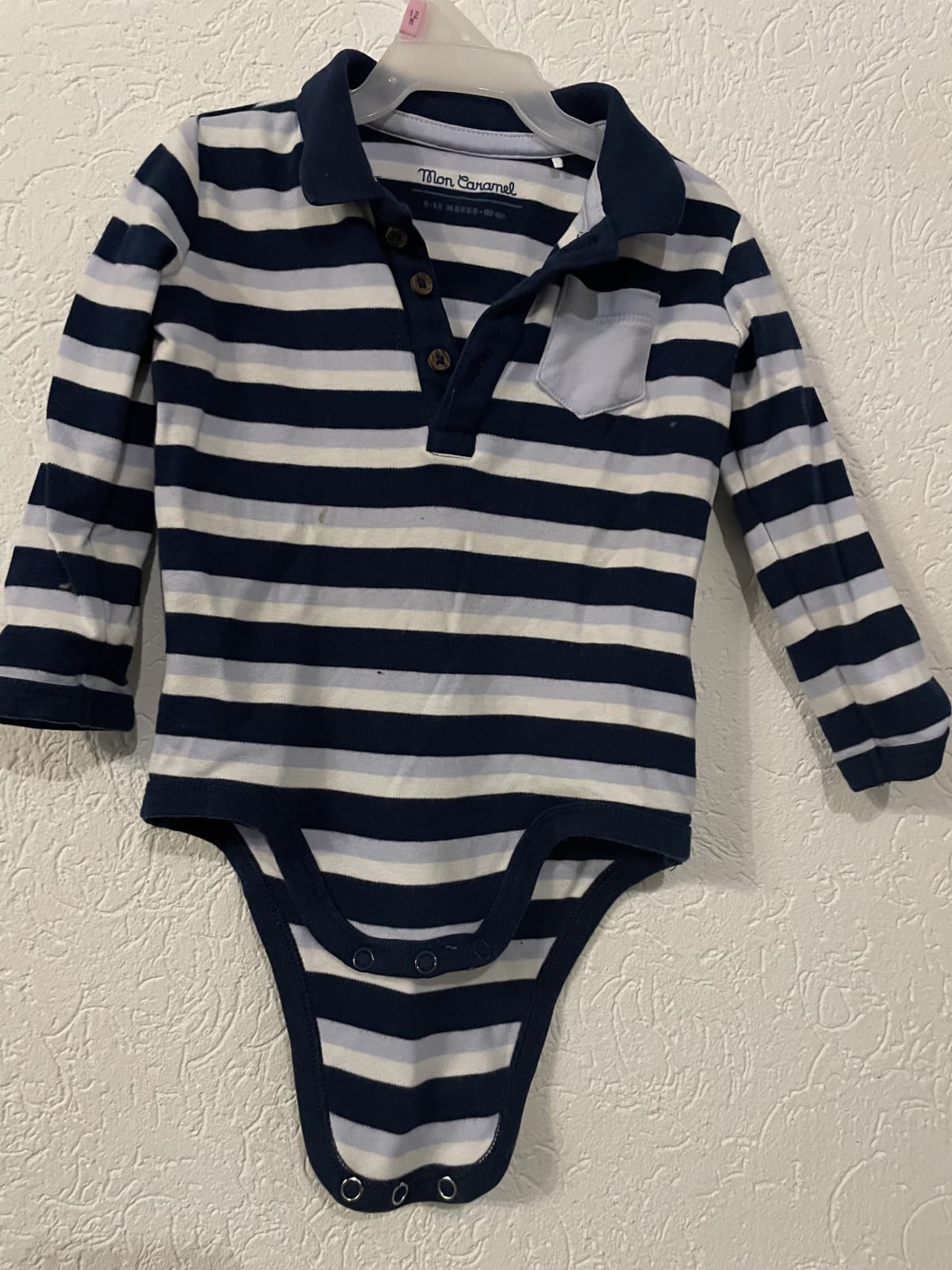 Este body de bebé es de color marino con rayas blancas, ideal para mantener a tu pequeño cómodo y a la moda. Tiene un diseño de cuello tipo polo y botones en la parte frontal. El estado es bueno, sin manchas visibles, pero con signos de uso. Perfecto para el día a día o para ocasiones especiales.