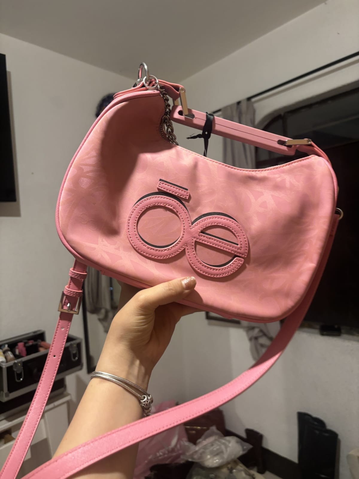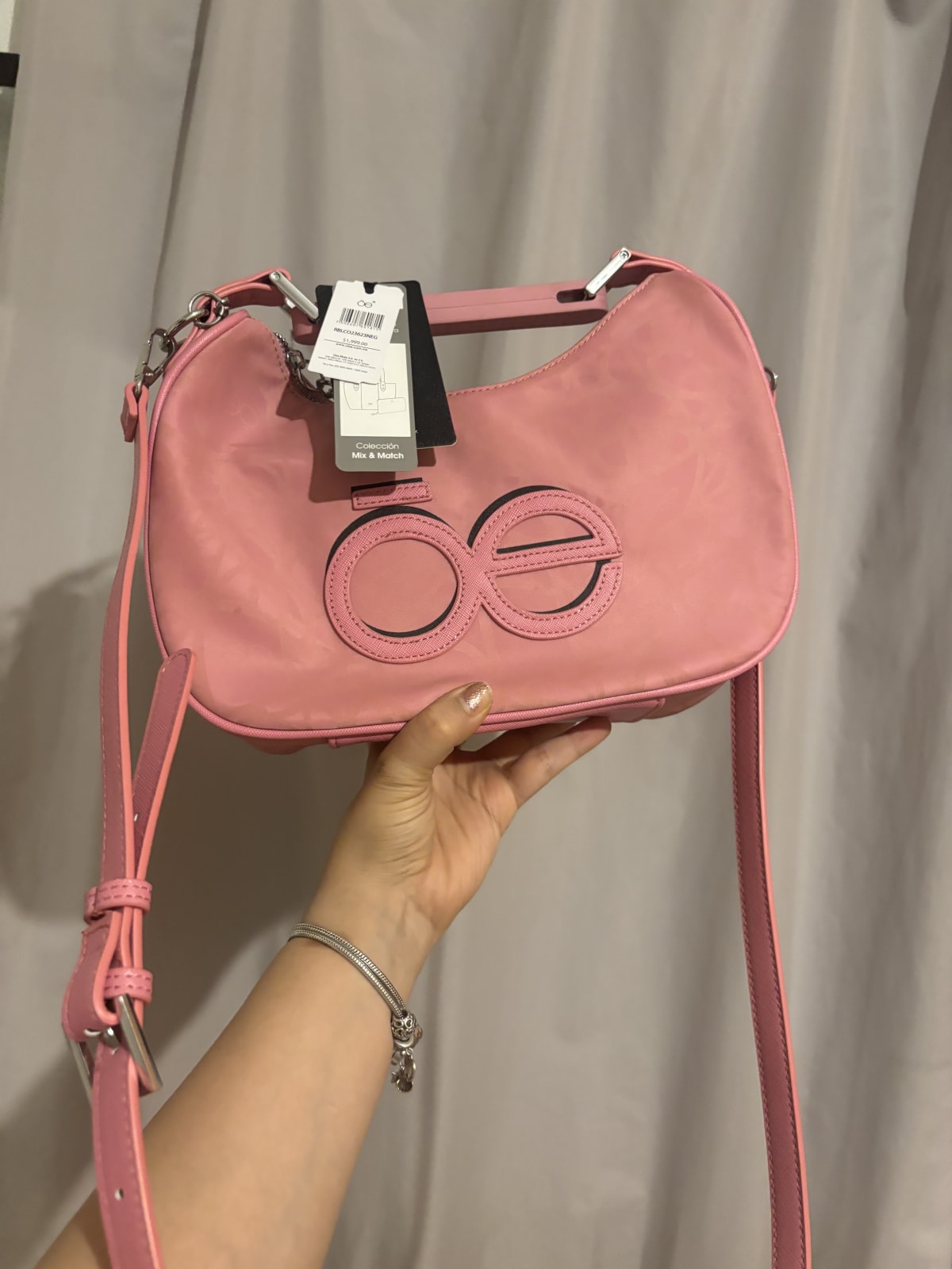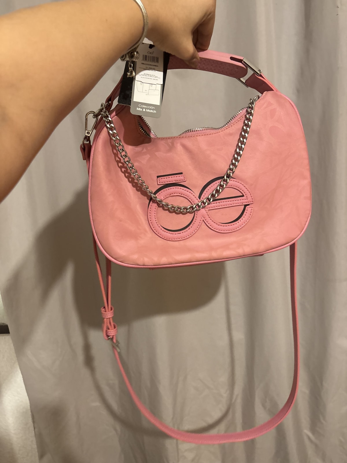 Este bolso de mano en color rosa es perfecto para cualquier ocasión. Tiene un diseño moderno con detalles en cadena y viene con etiquetas originales. En buen estado, sin daños visibles, ideal para complementar tu outfit diario.