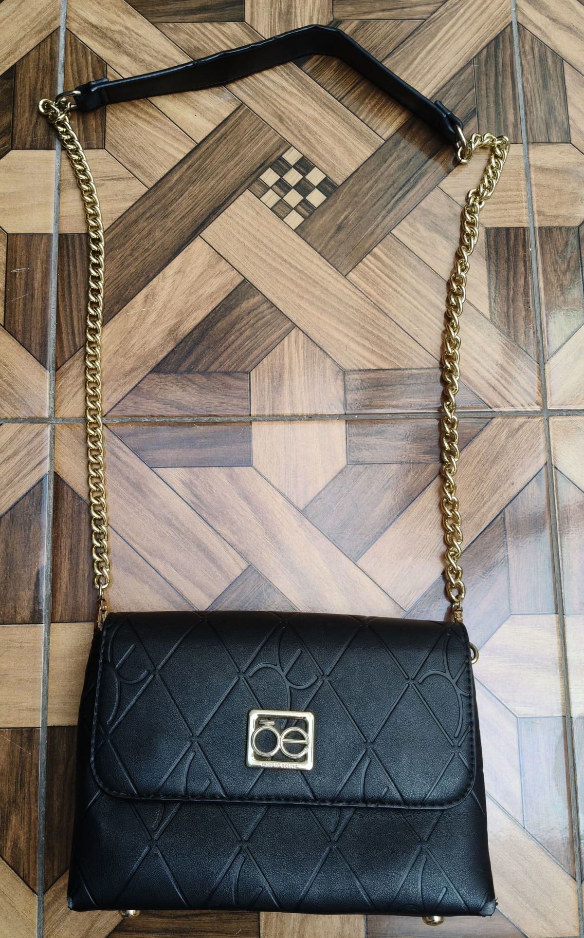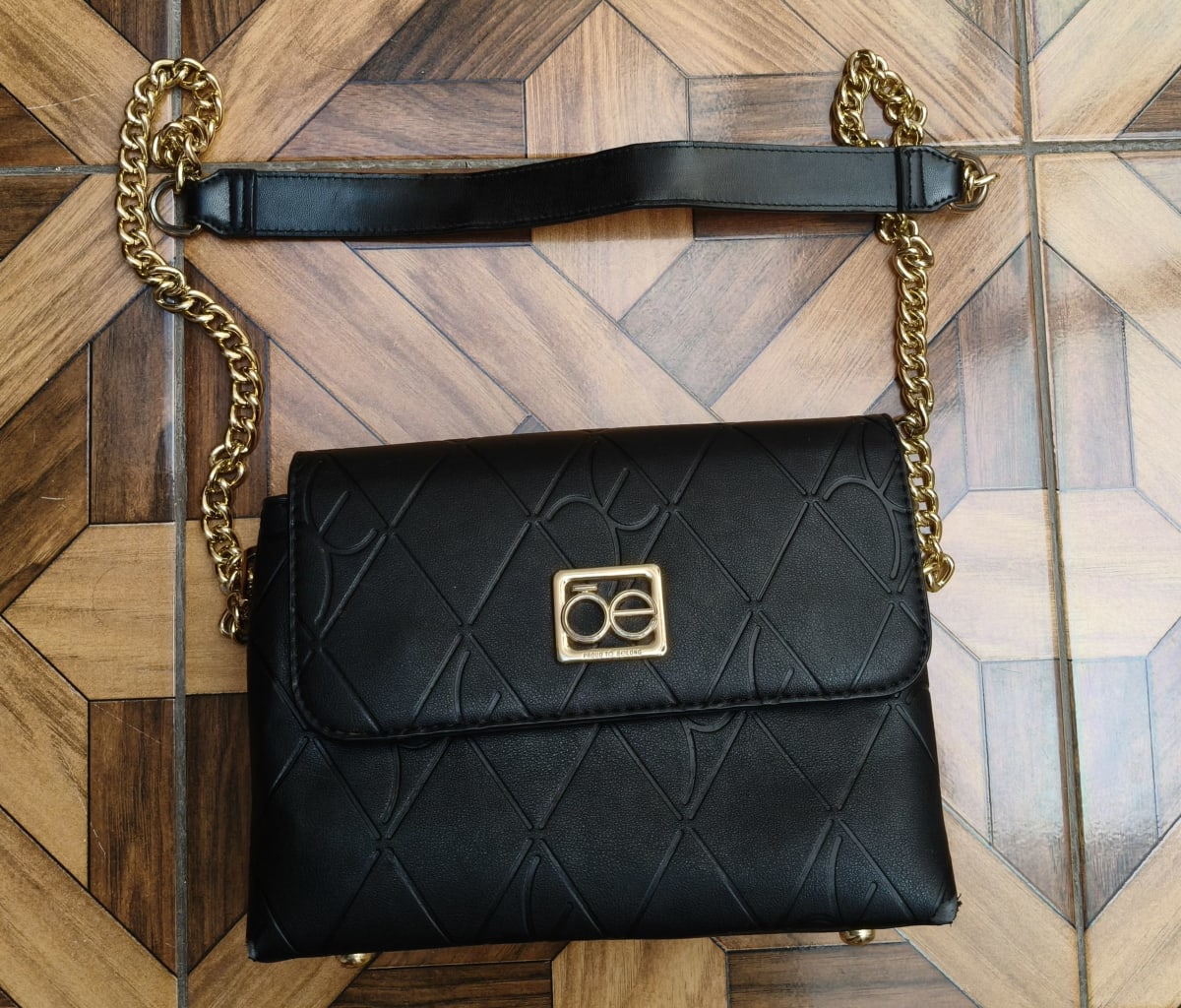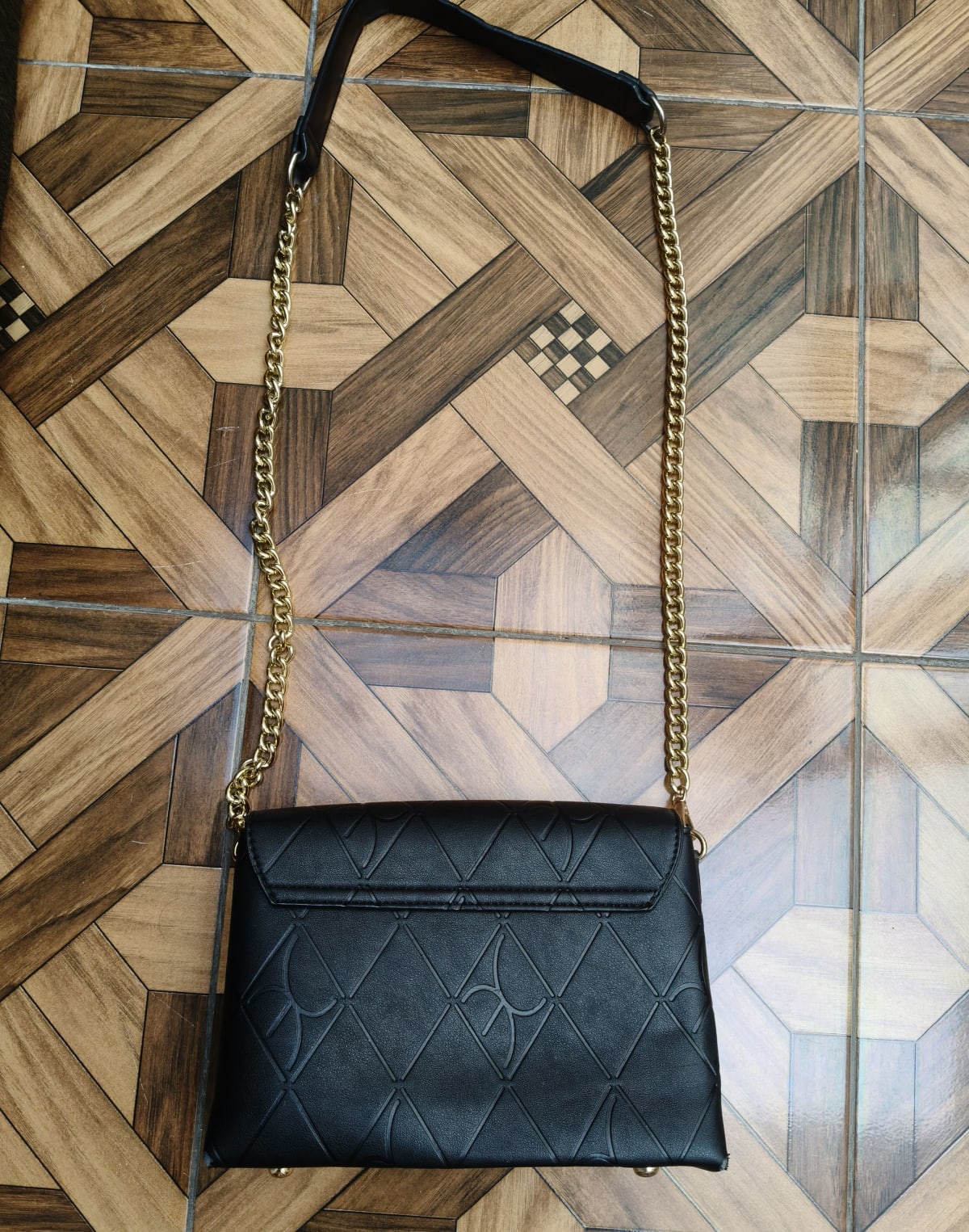 Bolso de mano en color negro con detalles en relieve y cadena dorada. El interior cuenta con varios compartimentos, incluyendo uno con cierre. En buen estado, en las esquinas esta raspadas, ideal para uso diario o salidas especiales. Incluye correa ajustable.