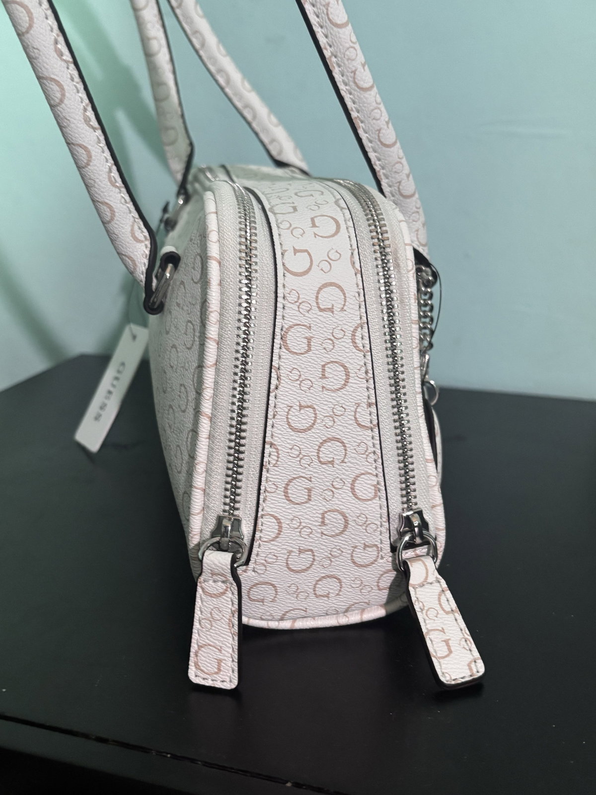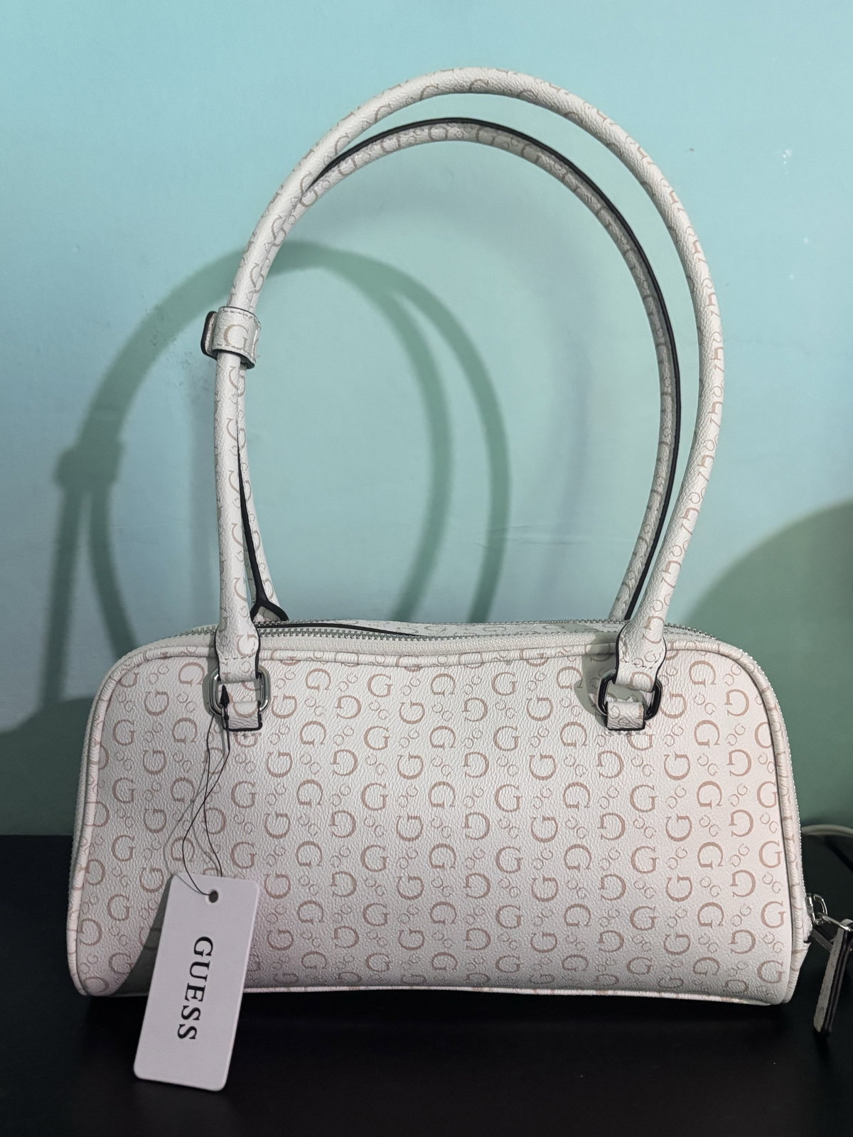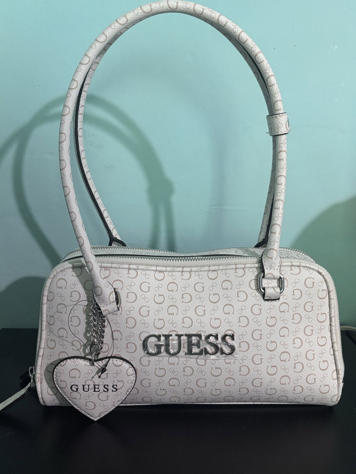 Hermoso bolso shoulder de la marca Guess, completamente nuevo. Es de color blanco con letras beige y cuenta con un charm en forma de corazón que es un espejito. Tiene doble cierre y sus medidas son 29 cm de largo, 16 cm de alto y 9 cm de ancho. Ideal para complementar cualquier outfit.