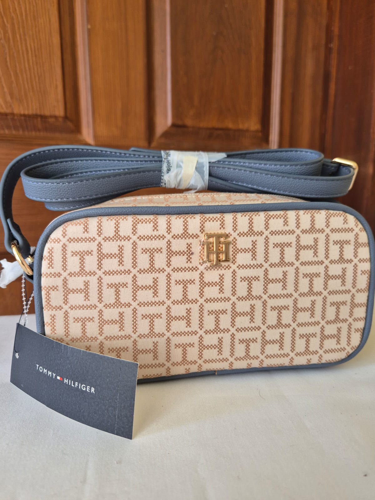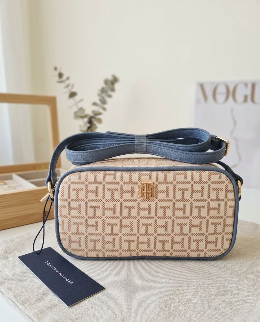 Bolso de la marca Tommy Hilfiger en color beige con detalles en azul. Se encuentra en excelente estado, nuevo, con etiqueta original. Ideal para uso diario o salidas casuales. Cuenta con un diseño moderno y práctico, perfecto para llevar lo esencial.