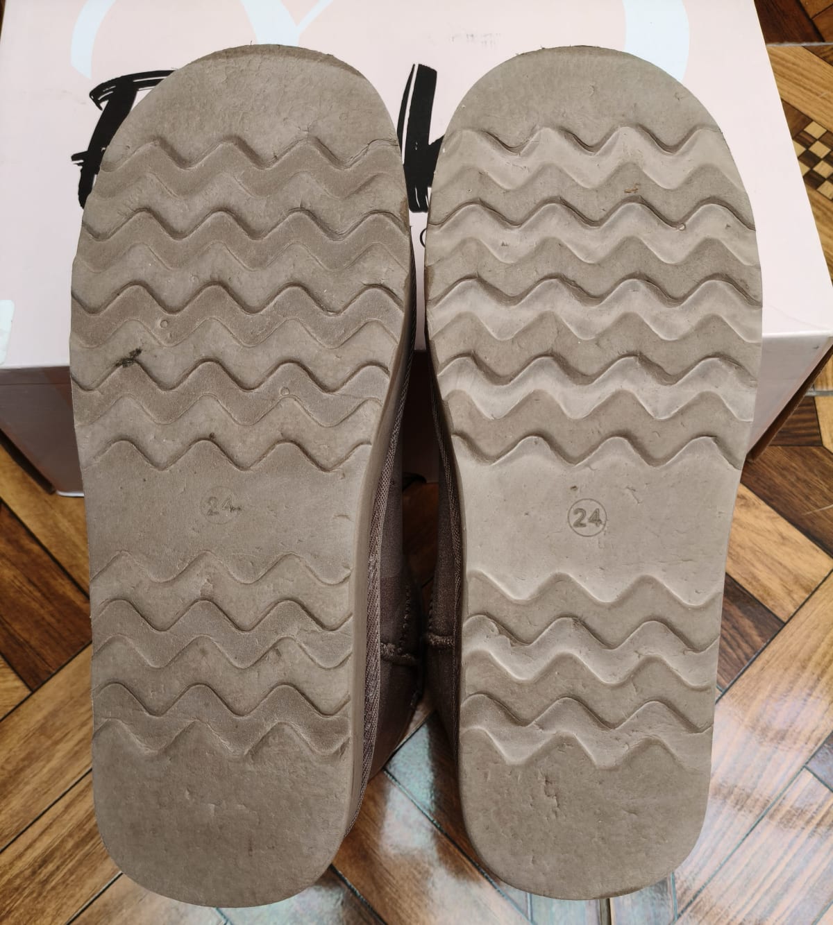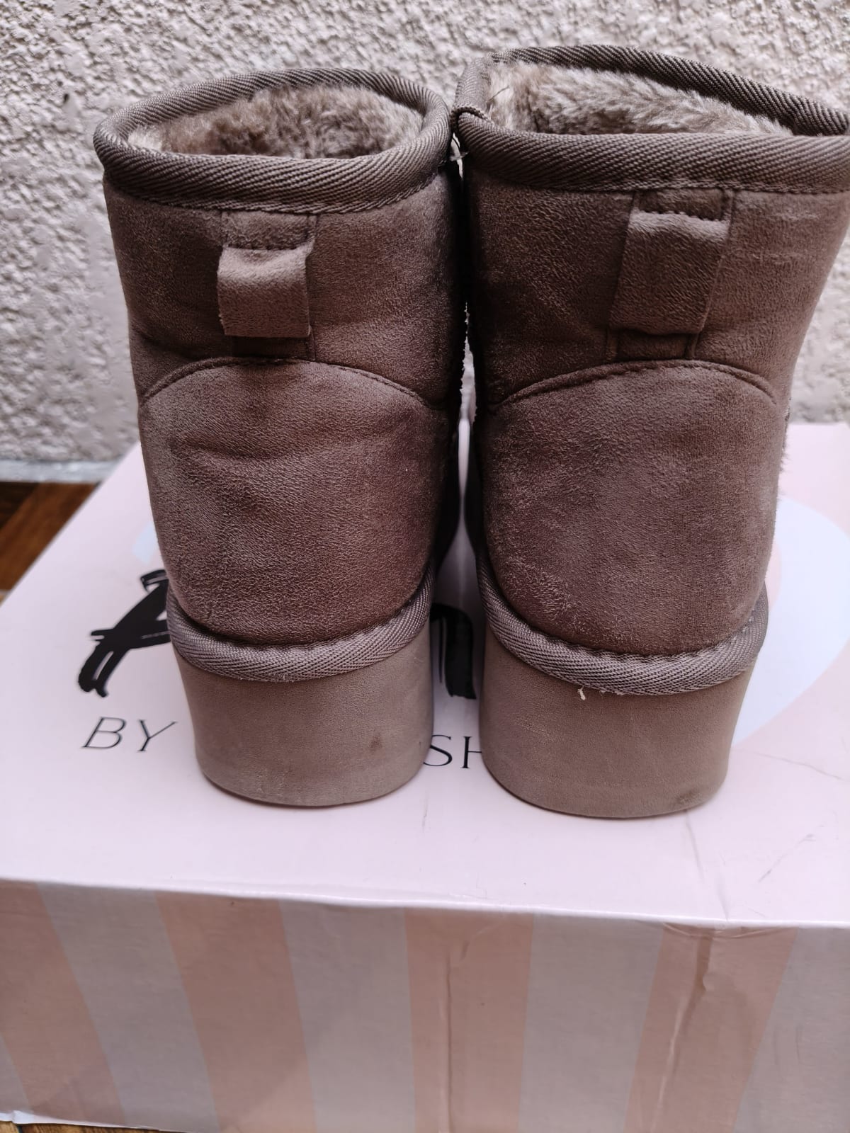Estas botas de invierno son de piel sintética en un tono marrón suave. Están en buen estado, con un interior forrado que proporciona calidez y comodidad. La suela muestra un desgaste mínimo, lo que indica un uso moderado. Incluyen la caja original, pero tienen algunas marcas visibles en la parte inferior. Y en la parte frontal pero imperceptible.