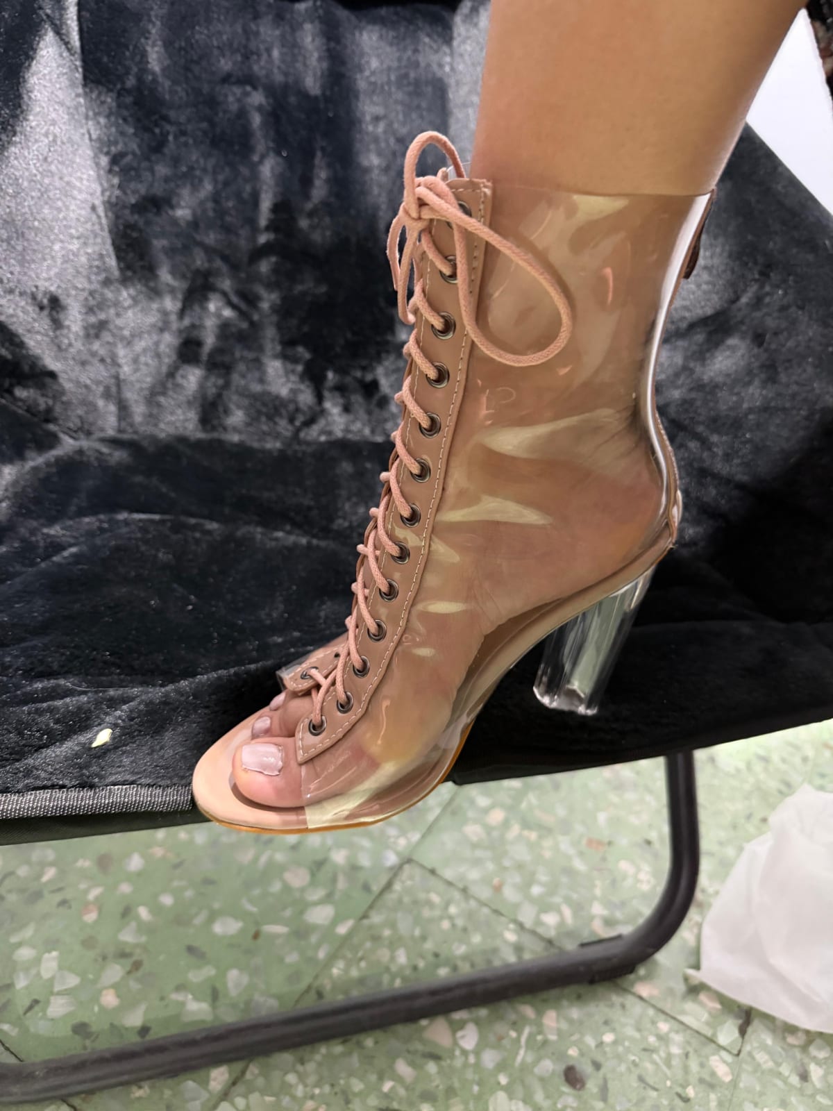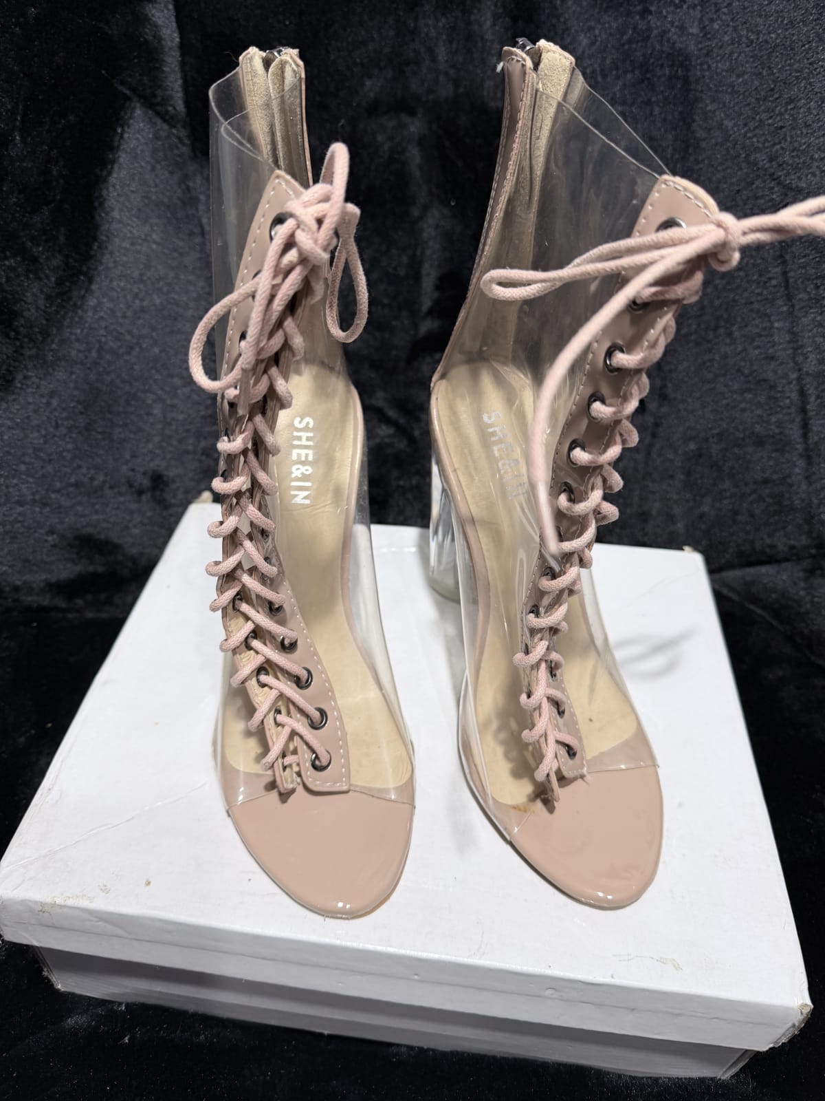 Vendo estas elegantes botas de tacón de la marca SHEIN. Están en buen estado, con un diseño transparente y tacón de acrílico. Tienen cordones en la parte delantera y son ideales para ocasiones especiales. No se observan defectos significativos, solo ligeras marcas de uso.