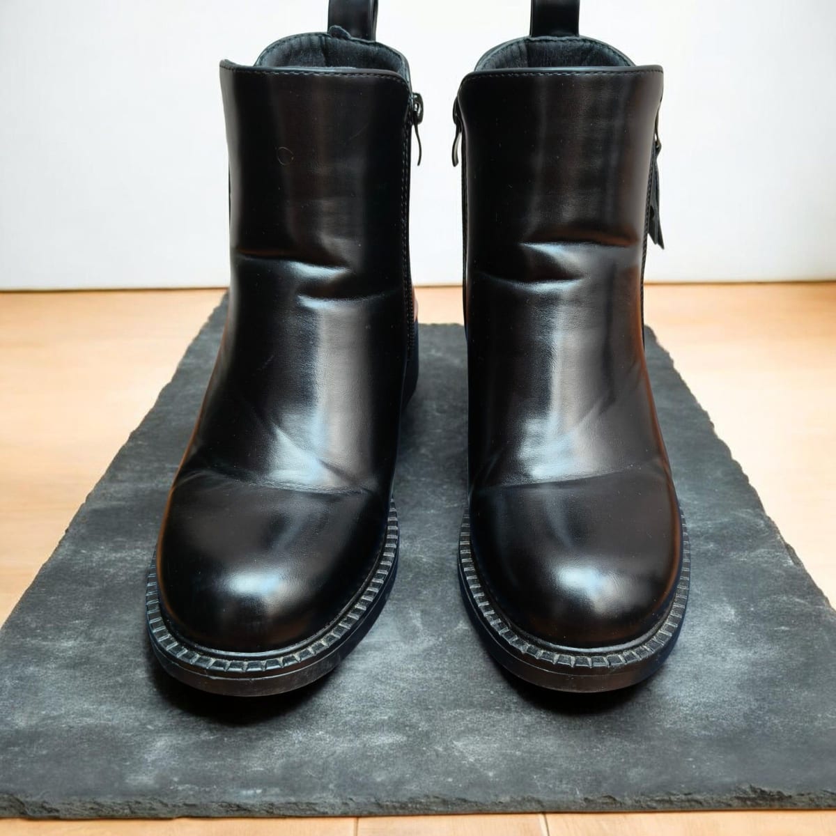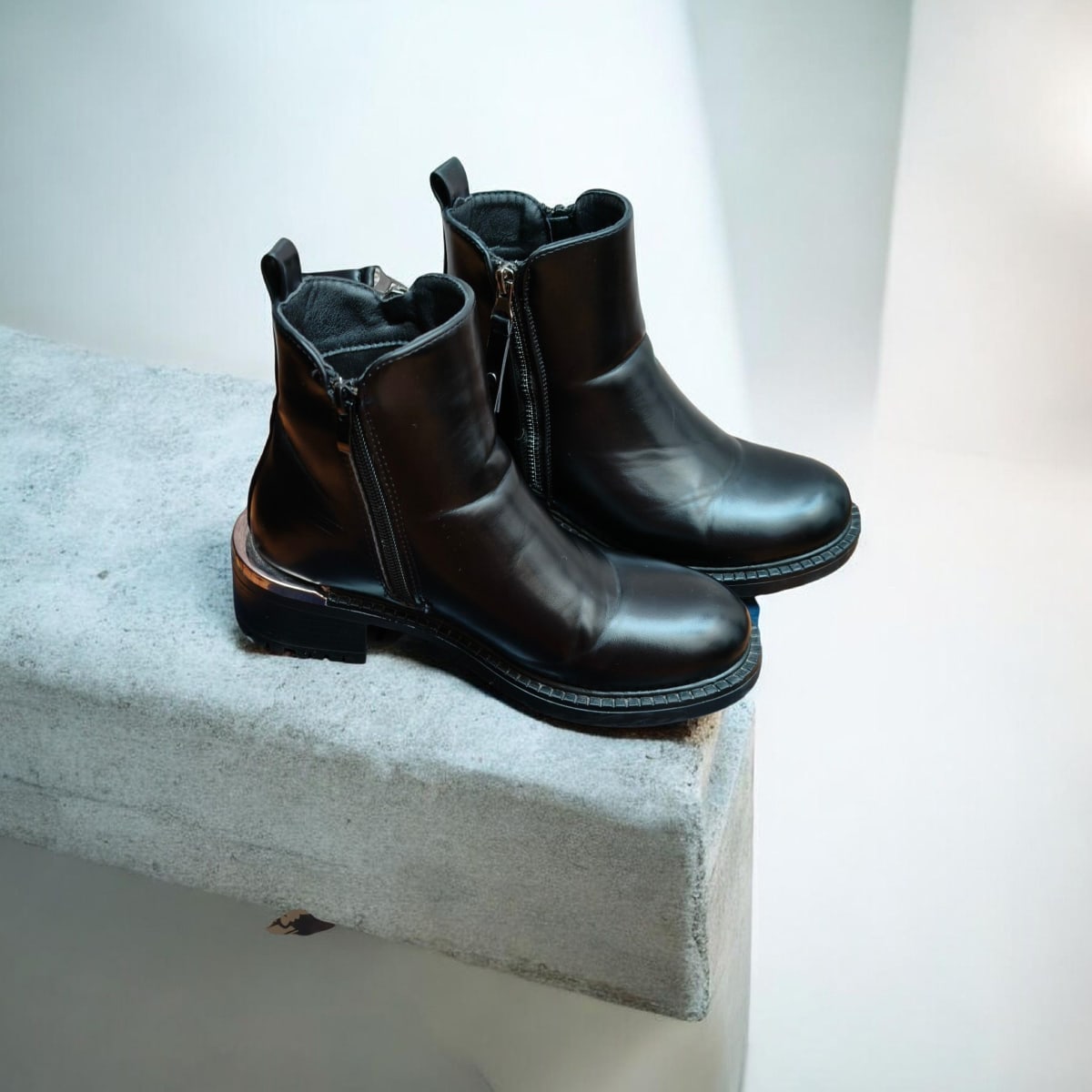 Estos botines de cuero negro de la marca Goodyear están en buen estado, con un diseño elegante y moderno. Presentan un cierre lateral y un detalle metálico en el tacón. La suela muestra un uso moderado, pero aún tienen mucha vida útil. Incluyen su caja original.