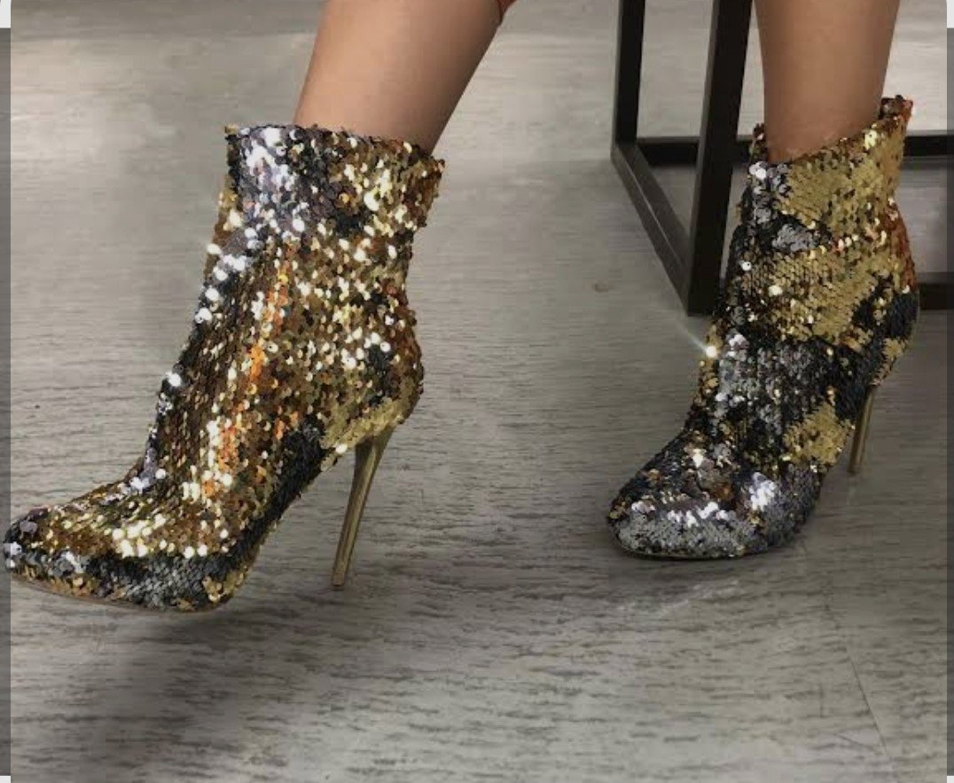 Botines Brillantes ✨ ¡Pura tendencia y estilo! Confeccionados en lentejuelas reversibles que cambian de color, creando un efecto degradado dorado, plateado y negro tipo serpiente. Diseño moderno con tacón aprox. 10 cm Perfectos para elevar cualquier look, 💃 ¡Luce espectacular y única