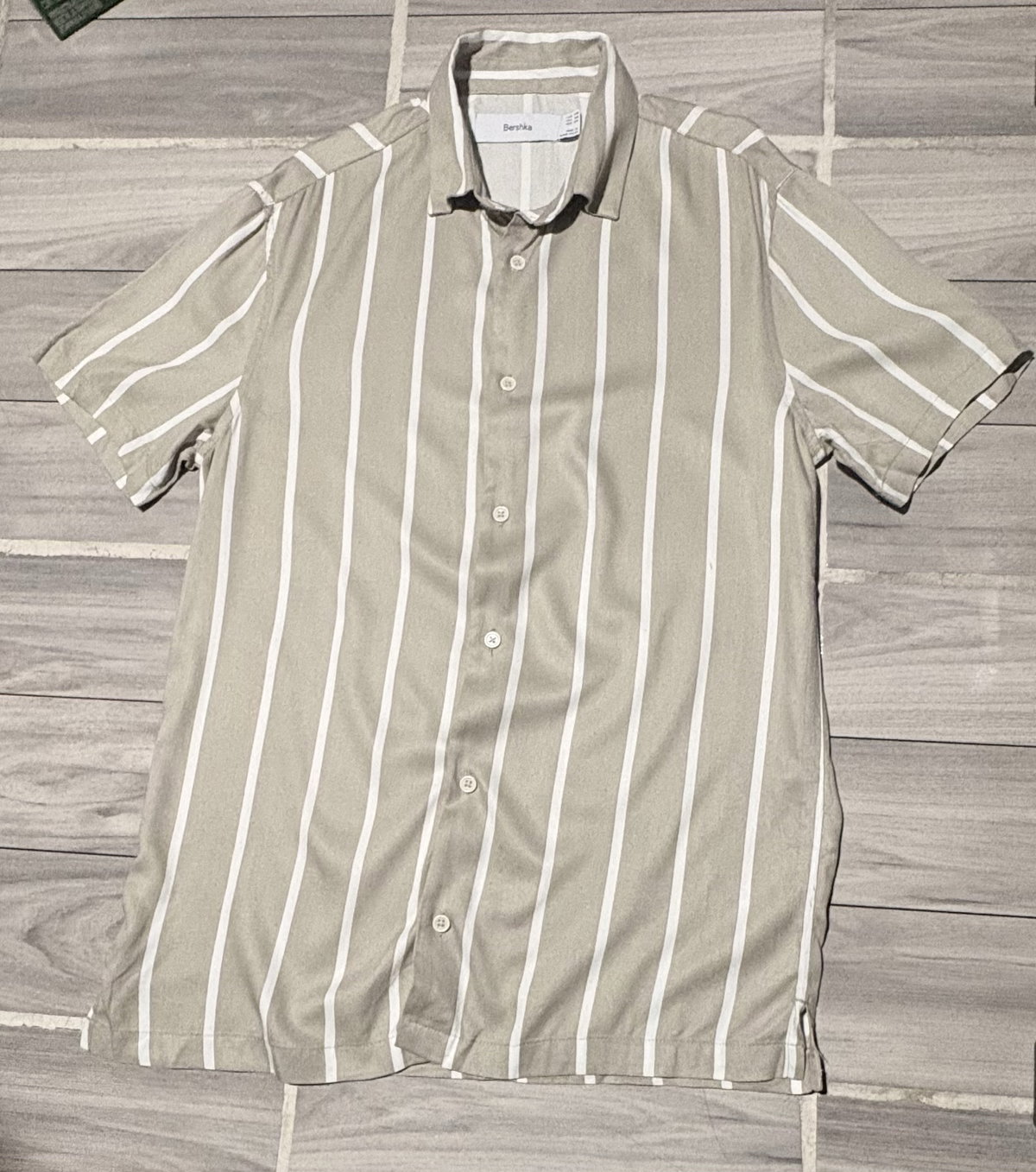 Camisa de la marca BERSHKA en talla XS, con un diseño de rayas en tonos claros. Está en estado nuevo, sin uso visible. Ideal para combinar con jeans o shorts en días cálidos. Perfecta para un look casual y fresco.