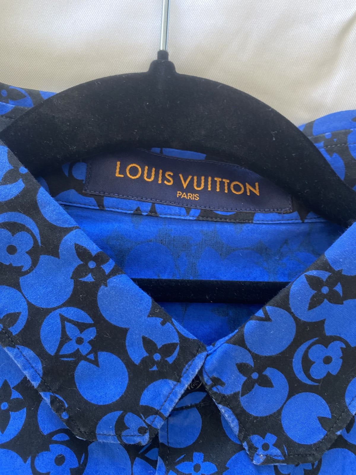 Camisa de la marca Louis Vuitton en color azul con un atractivo estampado. En buen estado, sin manchas visibles ni desgastes significativos. Ideal para ocasiones casuales o formales talla grande