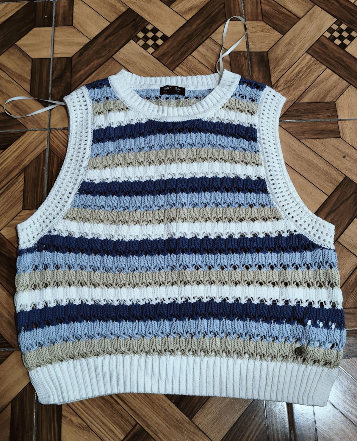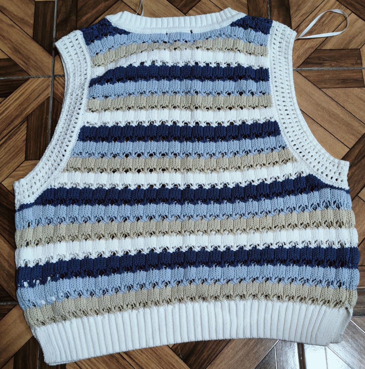 Chaleco de tejido ligero en tonos azul, beige y blanco. Ideal para combinar en looks casuales. En buen estado, sin defectos visibles. Perfecto para la temporada de entretiempo.