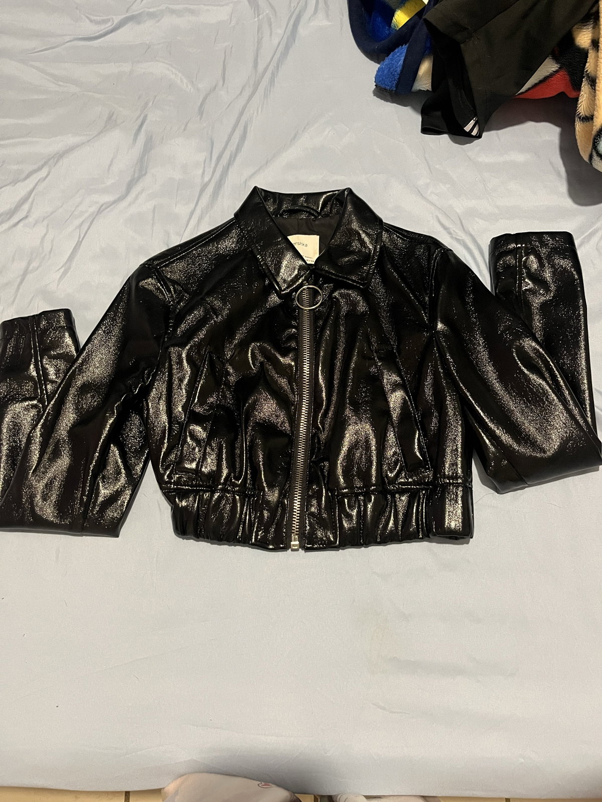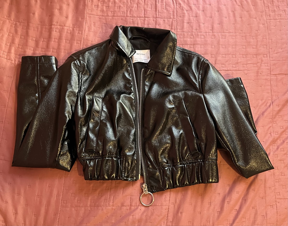 Chamarra negra de Bershka en excelente estado, apenas usada. Tiene un acabado brillante y un diseño moderno con cierre frontal y detalles en los bolsillos. Ideal para combinar con diferentes outfits. Sin defectos visibles.
