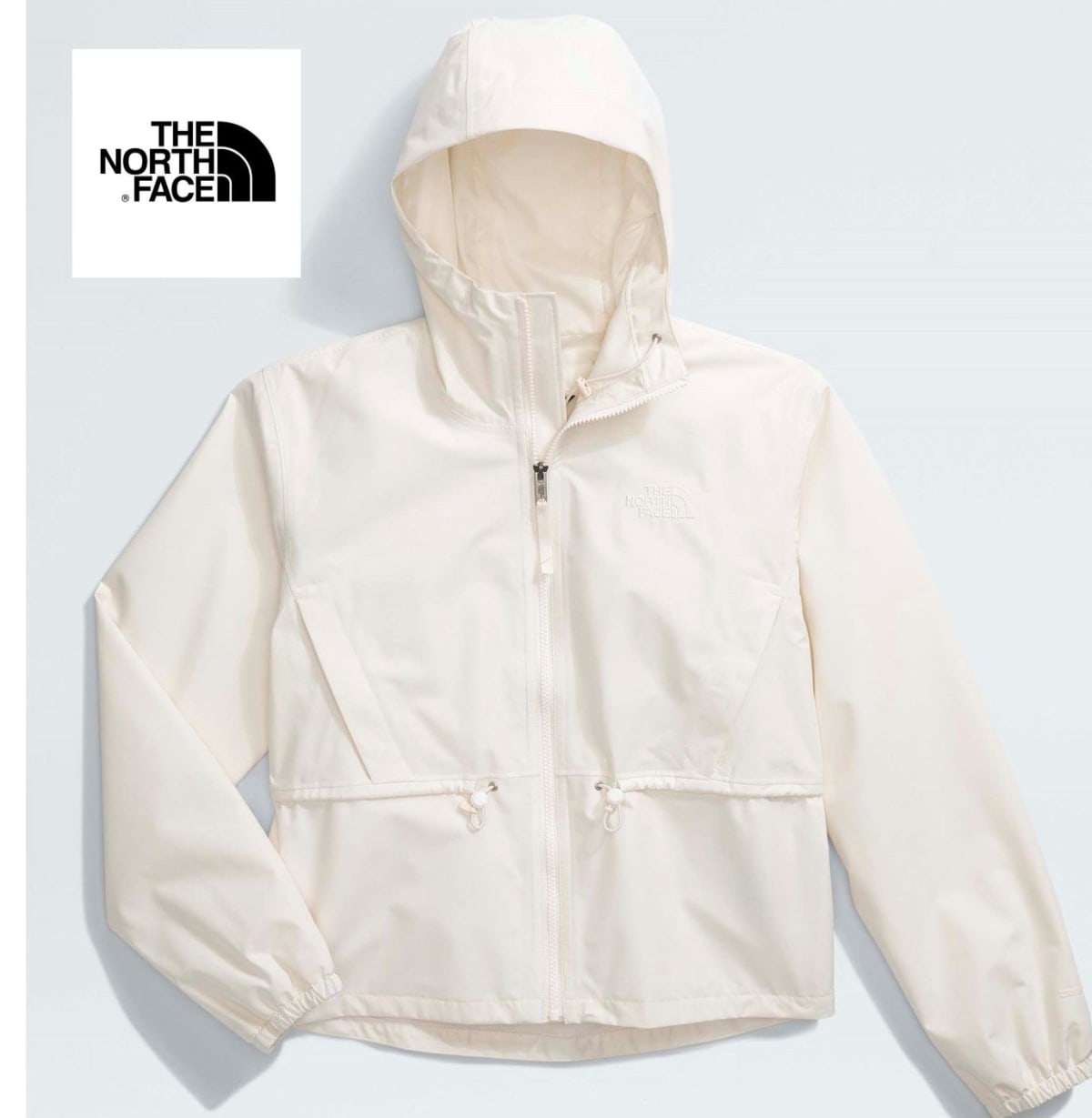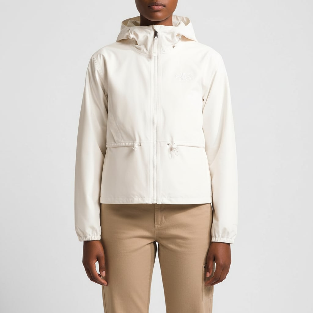 Chamarra de la marca The North Face en color blanco. Cuenta con capucha ajustable y dos bolsillos frontales. Ideal para actividades al aire libre o uso diario.