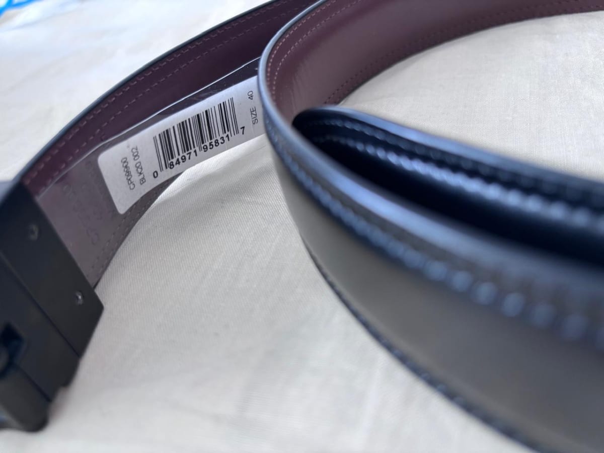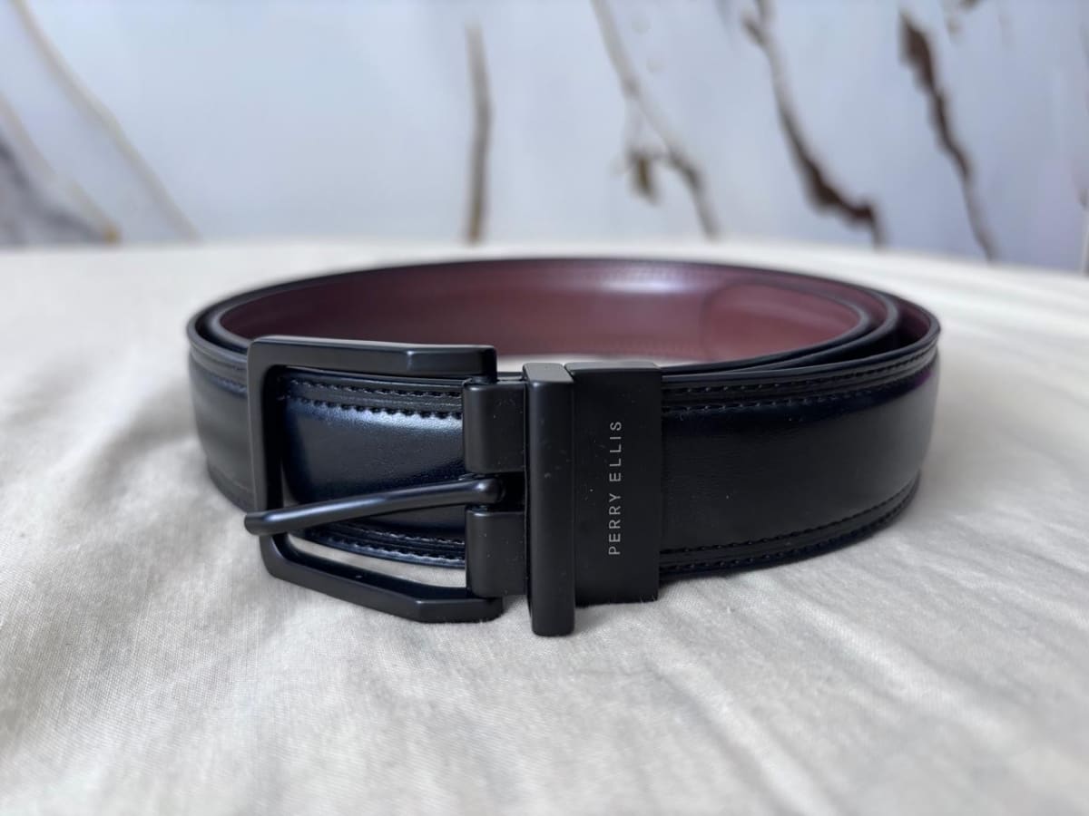 Cinturón de cuero negro de la marca Perry Ellis, tamaño 40. con hebilla metálica y detalles en costura. Ideal para complementar cualquier atuendo formal o casual. No presenta defectos visibles.