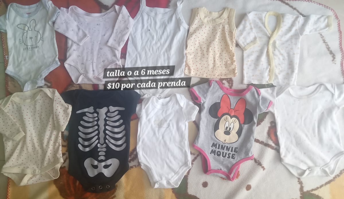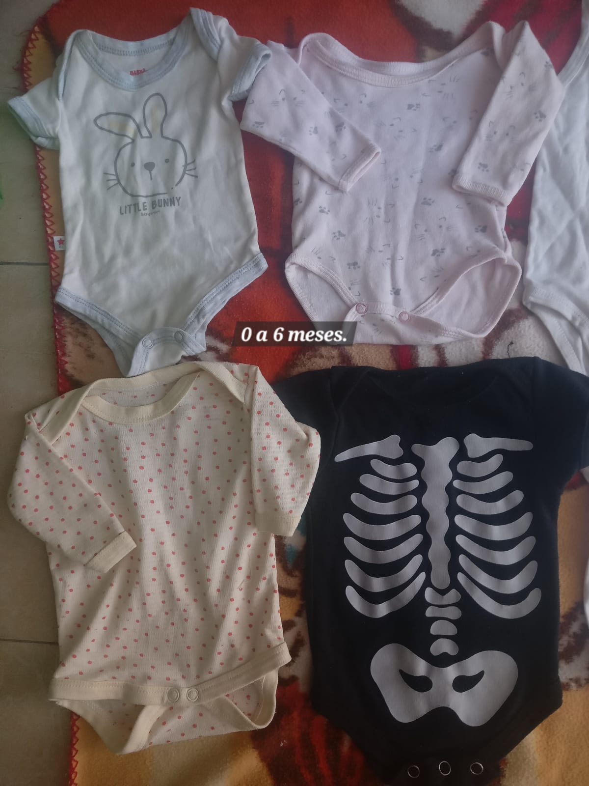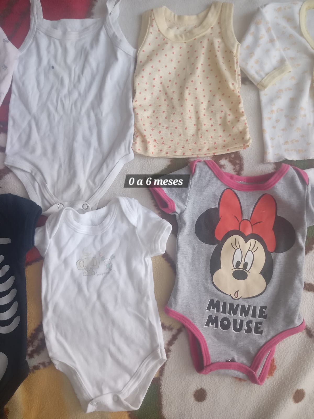 Este conjunto incluye varias prendas para bebés de talla 0 a 6 meses. Hay bodies de diferentes diseños, incluyendo uno de Minnie Mouse y otro con un diseño de esqueleto. Las prendas están en buen estado, aunque algunas pueden tener ligeras marcas de uso. Ideal para mantener a tu bebé cómodo y a la moda.