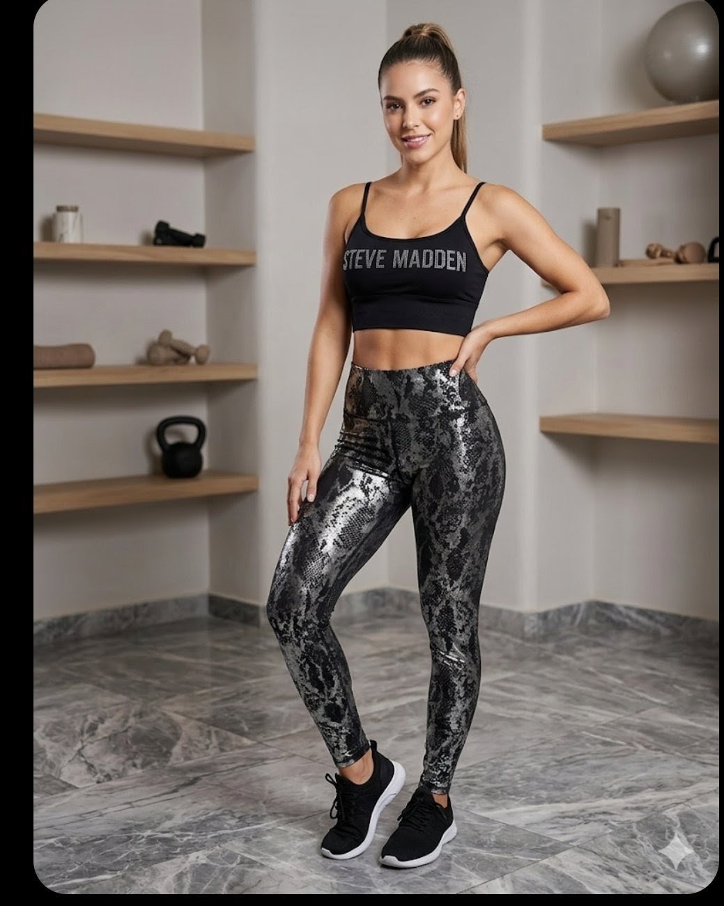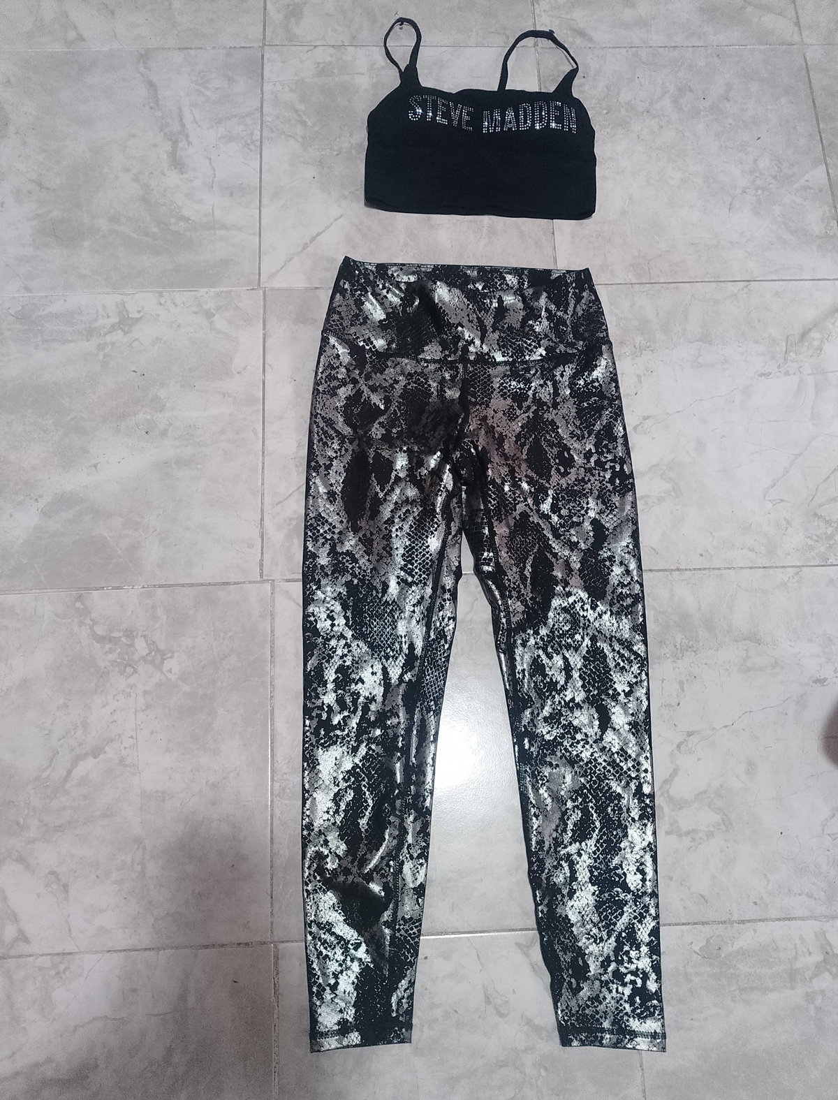 CONJUNTO DEPORTIVO - ¡SÚPER ESTILOSO! 🔥 💖 ¡Se ve increíble puesto! Top negro con letras brillantes y licra con diseño de serpiente metalizada que estiliza muchísimo. Material suavecito y elástico Cintura: 33 cmCadera: 38 cmTiro: 30 cmLargo: 90 cm Talla: M top Steven Madden legends designed los angeles top s legends m