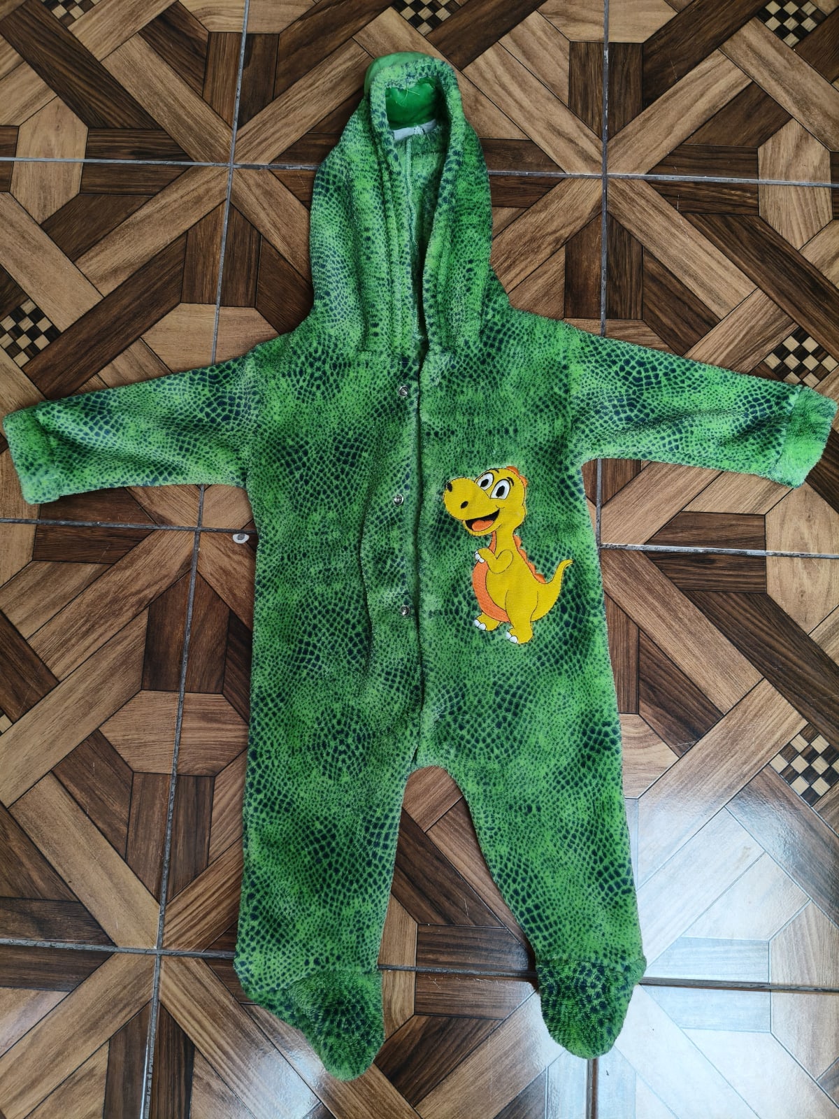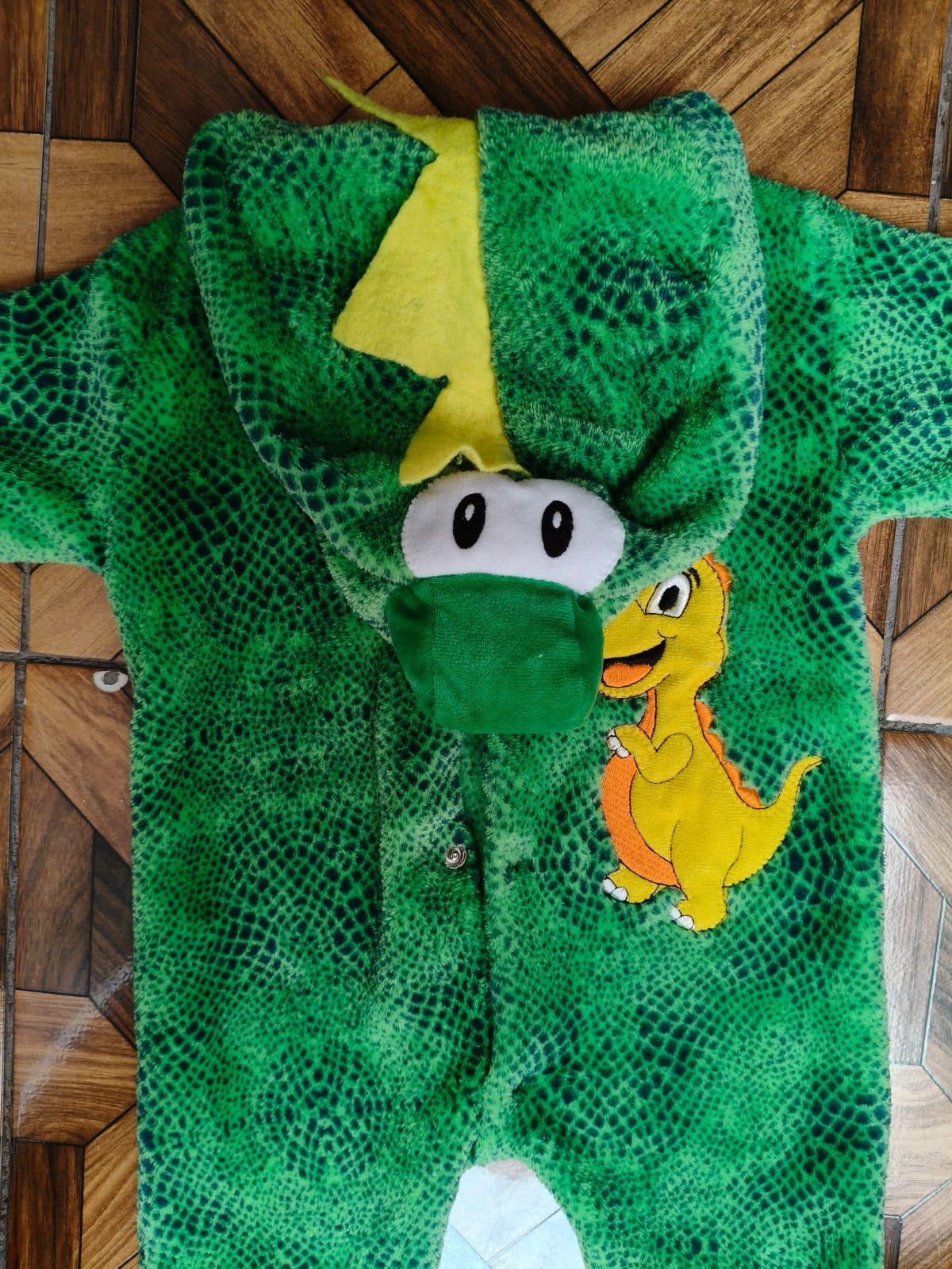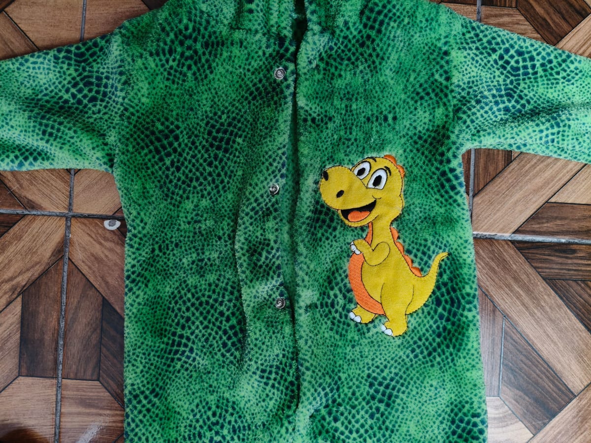 Este disfraz de dinosaurio es perfecto para mantener a tu pequeño abrigado y divertido. Está hecho de un material suave y cálido, ideal para el clima fresco. Presenta un diseño colorido con un simpático dinosaurio en el frente y detalles en la capucha. En buen estado, sin manchas visibles ni desgastes significativos.