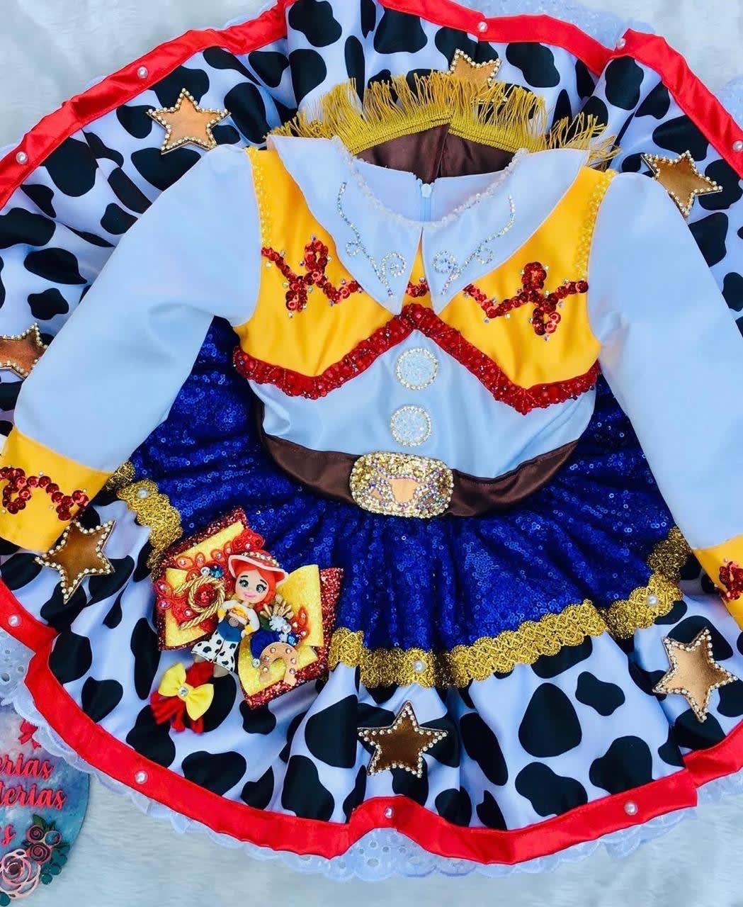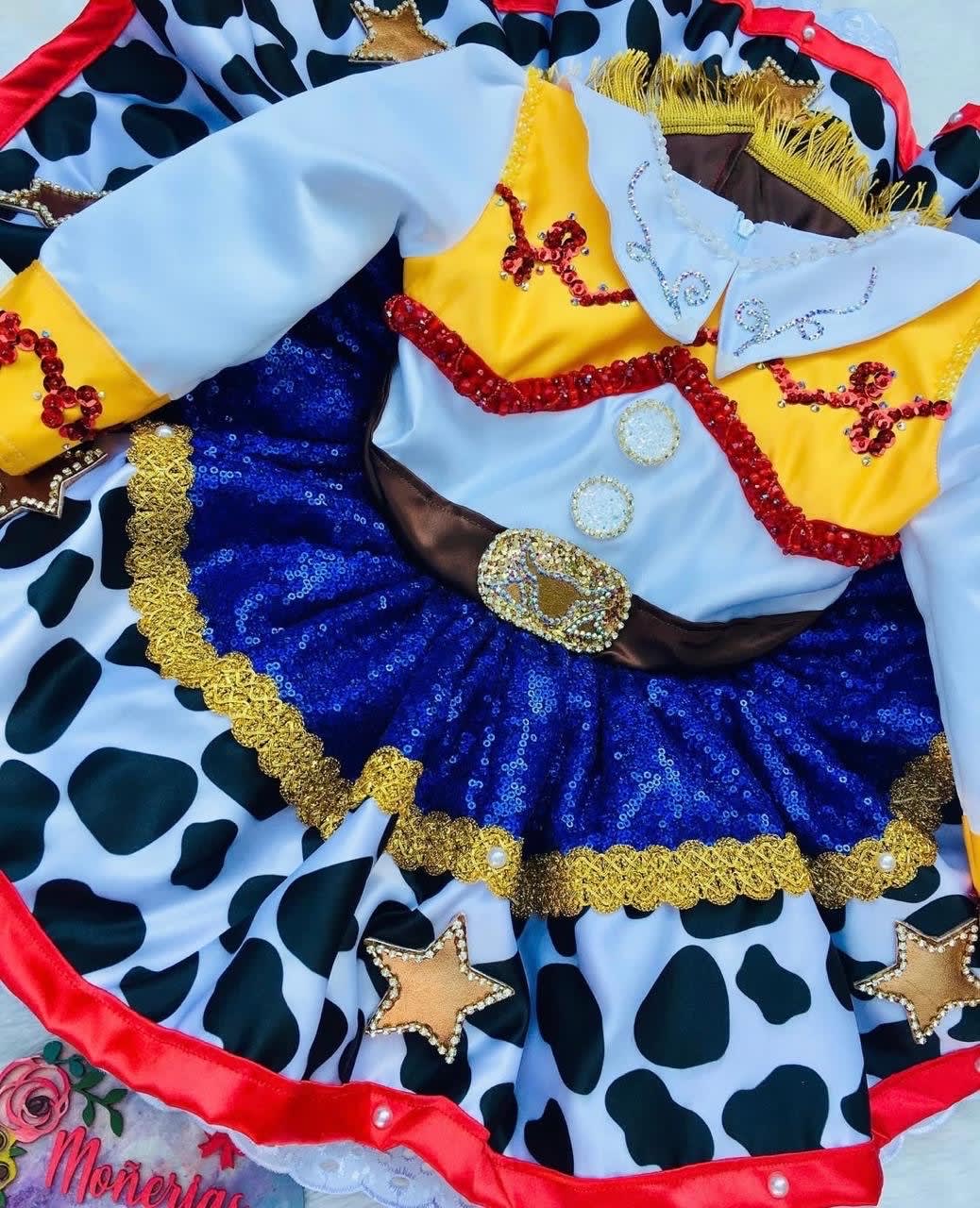 Este encantador disfraz de vaquera está diseñado para niñas, inspirado en el personaje de Jessie de Toy Story. Presenta un vestido con detalles brillantes, como lentejuelas y bordados, en colores vibrantes de amarillo, azul y blanco con estampado de vaca. El disfraz está en excelente estado, sin defectos ideal para fiestas de disfraces o Halloween.