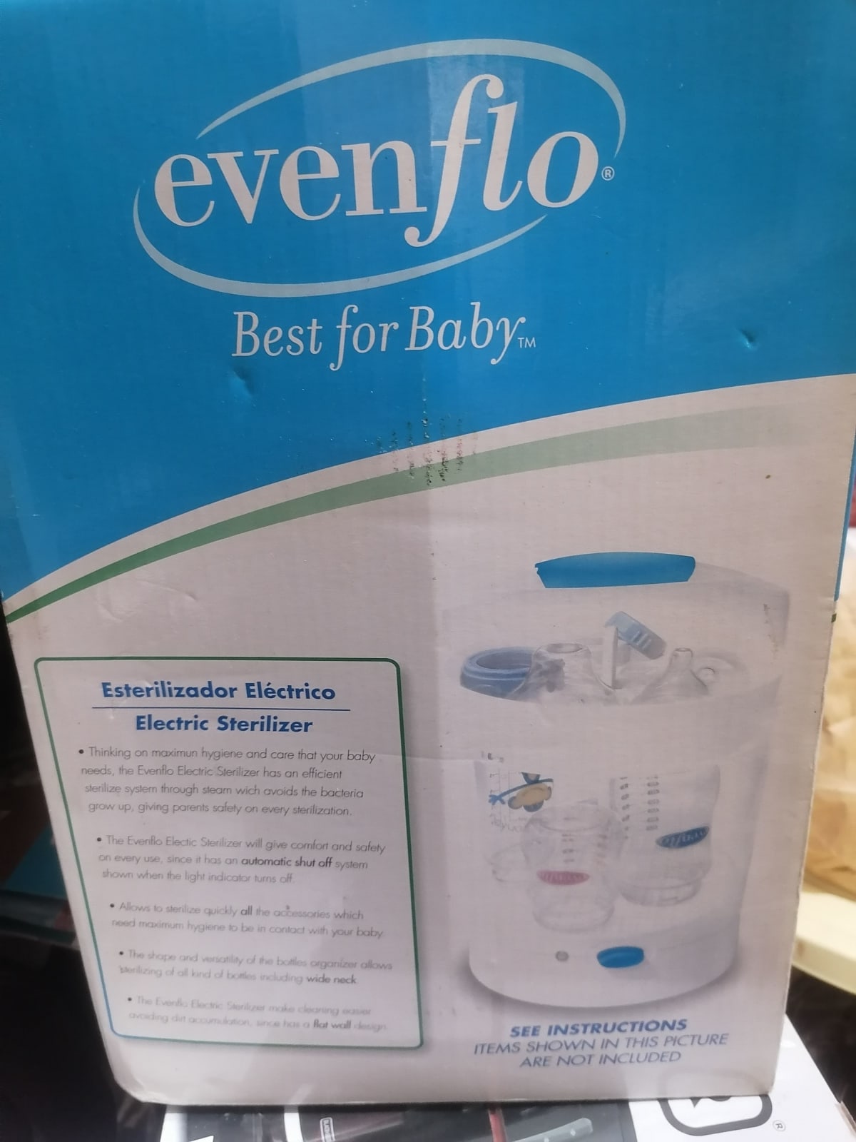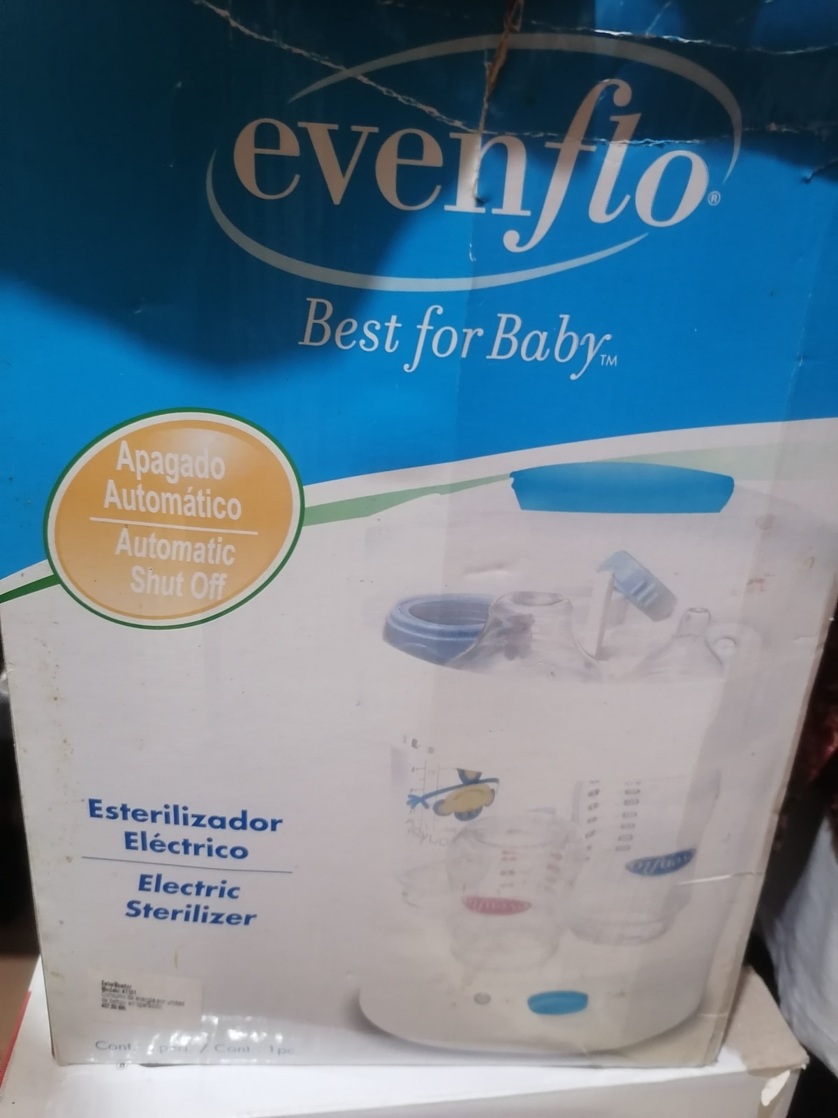 Esterilizador eléctrico de la marca Evenflo, ideal para mantener la higiene de los biberones y accesorios de tu bebé. El producto está en buen estado, con un diseño que permite esterilizar rápidamente. Incluye un sistema de apagado automático y es fácil de usar. La caja presenta algunos signos de desgaste, pero el esterilizador en sí está en condiciones funcionales.