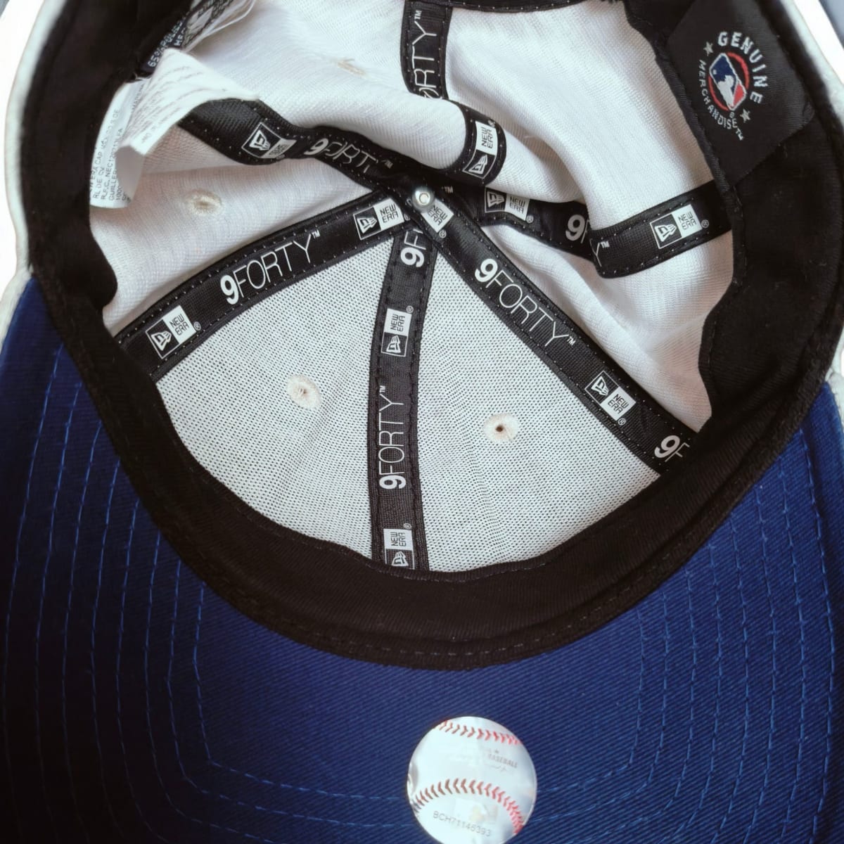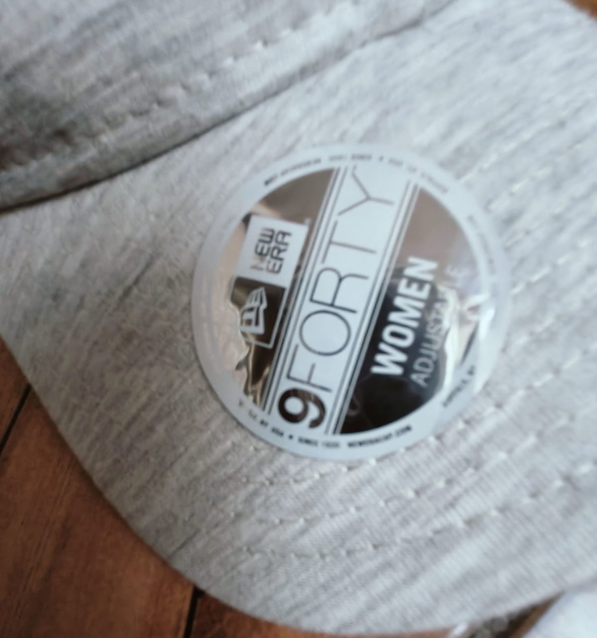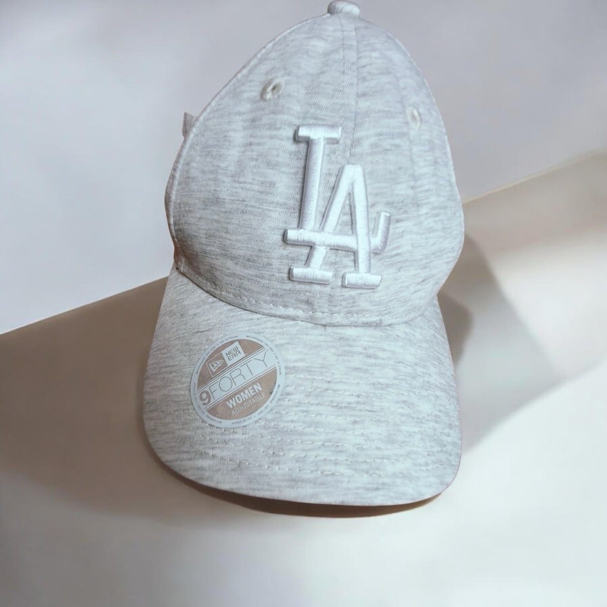 Gorra New Era 9FORTY ajustable para mujer en color gris. Está en buen estado, con un diseño moderno y la emblemática letra 'LA' en la parte frontal. La gorra cuenta con una etiqueta que indica que es ajustable y tiene un interior limpio. Ideal para complementar cualquier outfit casual. Sin defectos visibles.