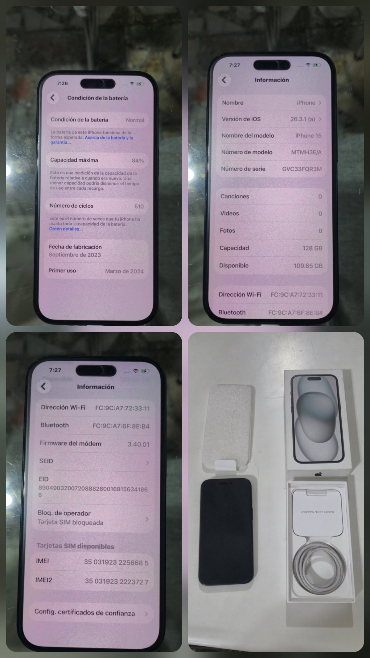 Vendo iPhone 15 de 128GB en color negro, en estado 'como nuevo'. La batería tiene un 84% de salud y ha sido muy bien cuidado. Incluye caja y cable original, así como una funda y mica de privacidad. Ideal para quien busca un smartphone de alta gama a un buen precio. Precio a tratar