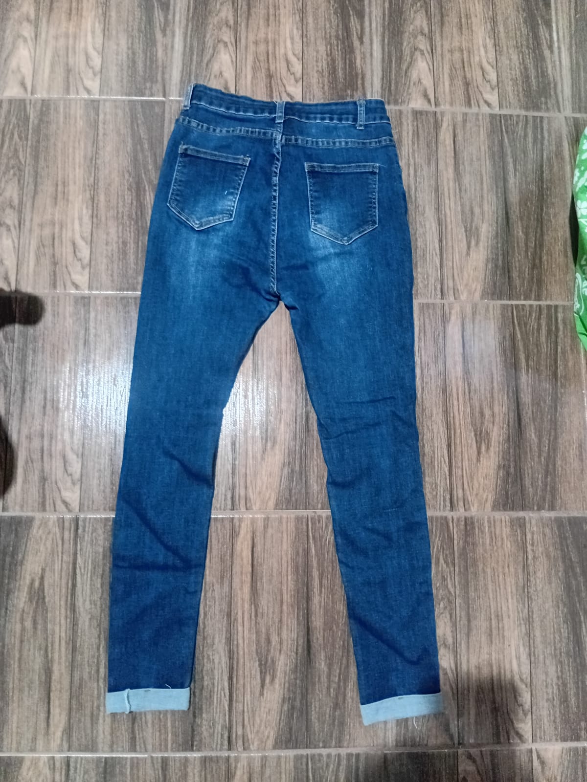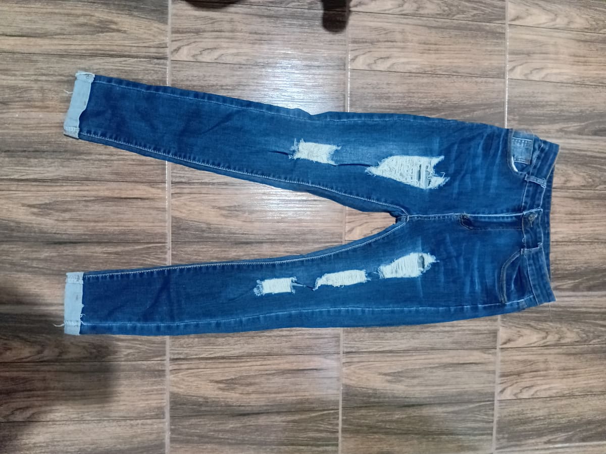 Jeans de mezclilla en buen estado, con detalles rasgados en las piernas que les dan un toque moderno. Tienen un ajuste entallado y son ideales para un look casual. No se observan manchas ni olores.