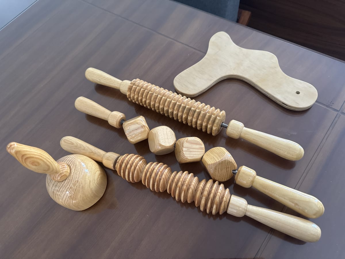 Kit de Maderoterapia incluye 5 piezas y 3 sábanas nuevas , para principiantes ! Cómo nuevos ! Solo se utilizó para el curso de inducción .