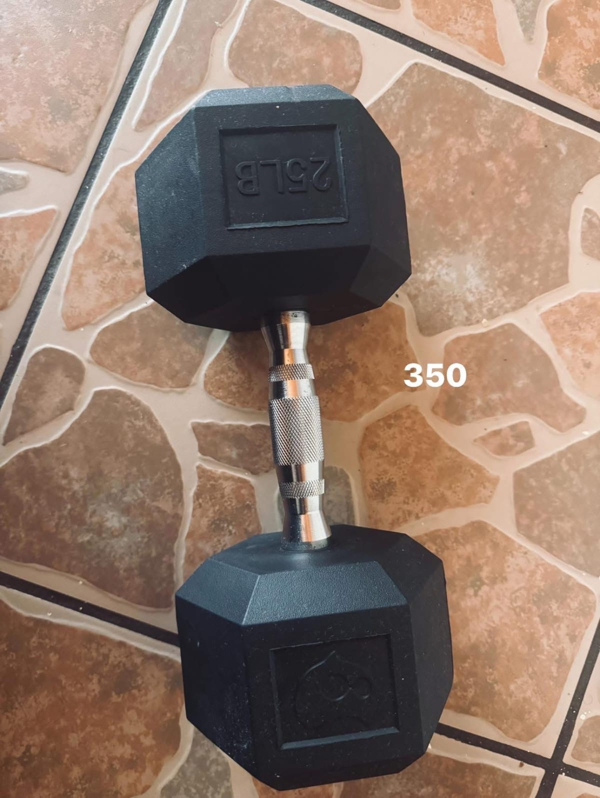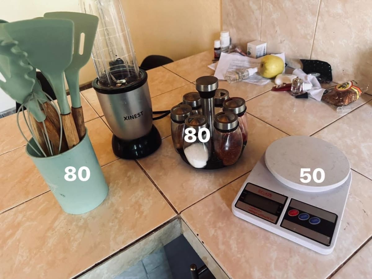 Incluye una mancuernas de 25 lbs, una báscula digital, un set de utensilios de cocina, un juego de especieros. Las mancuernas están en buen estado, la báscula tiene un ligero desgaste en la superficie. los especieros están completos y funcionan bien.