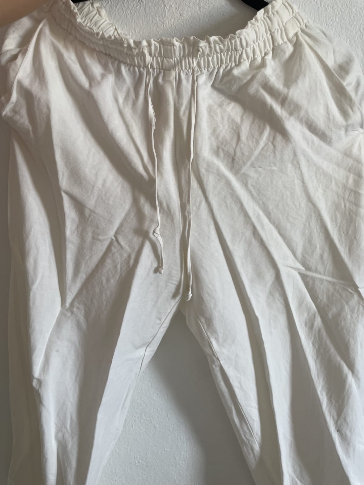 Lote que incluye varias prendas de mujer en buen estado. Contiene una sudadera gris con textura, una blusa beige bordada, un pantalón blanco ligero, una sudadera rosa con rayas y una blusa roja con detalles de lazo. Todas las prendas están limpias y listas para usar. Ideal para quienes buscan renovar su guardarropa a buen precio.
