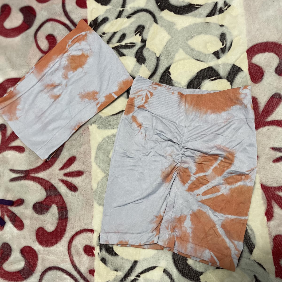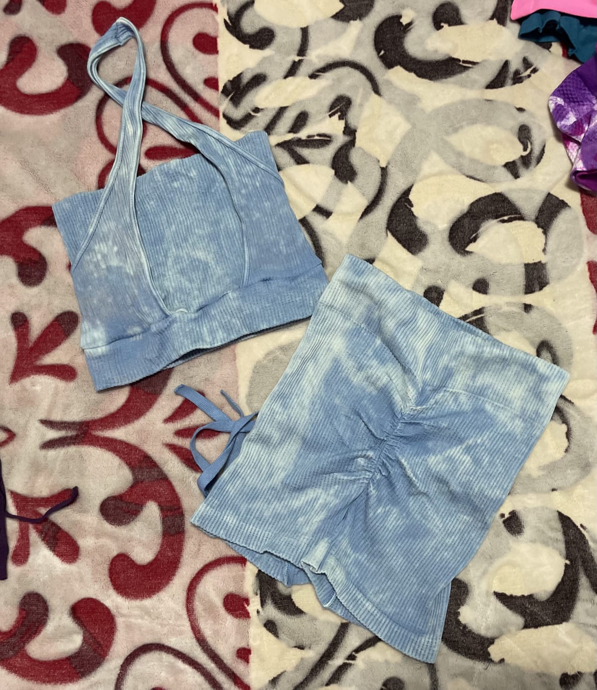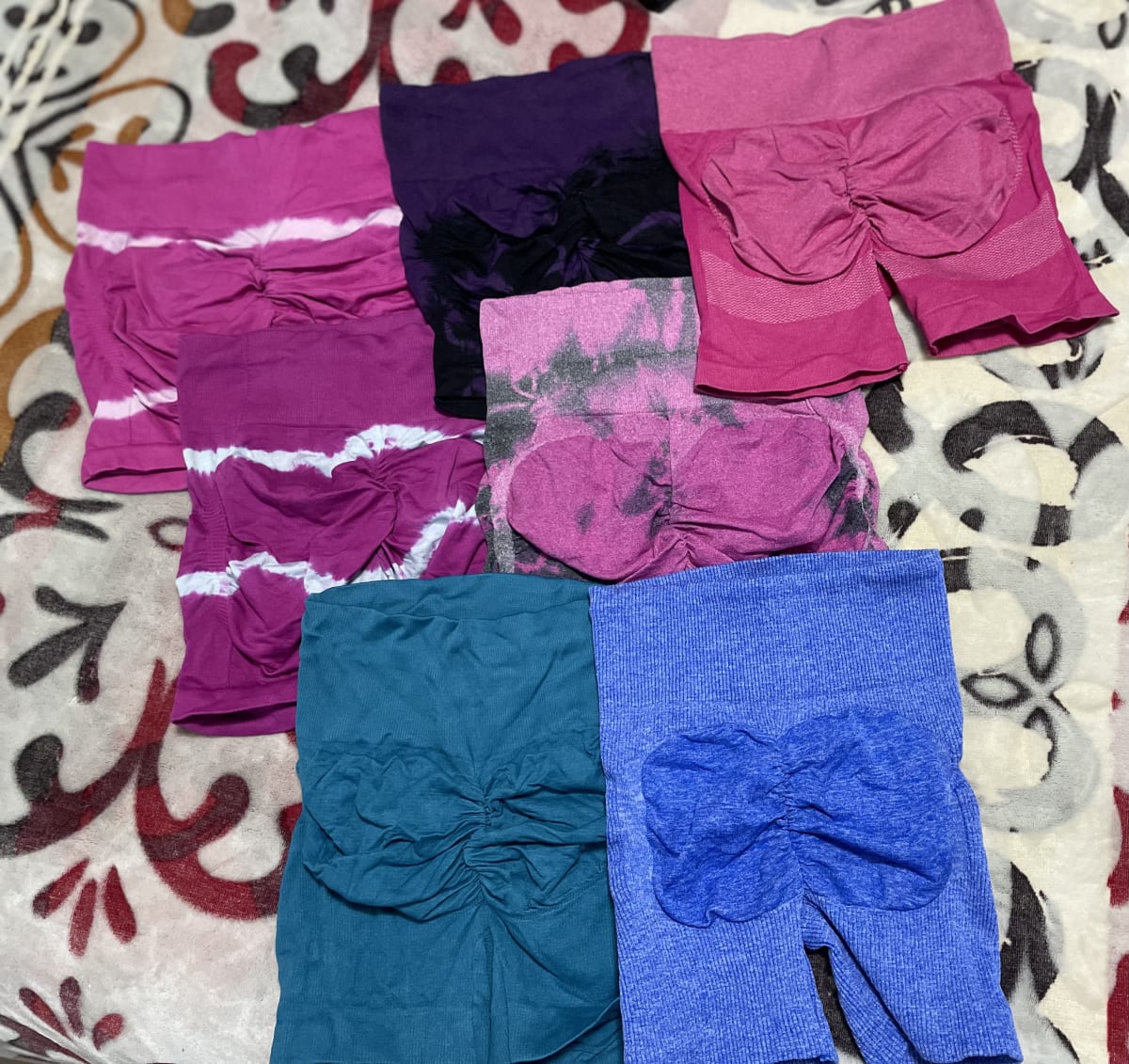 Este lote incluye varios shorts y tops deportivos en diferentes colores y estilos. Los shorts presentan detalles como fruncidos y patrones de tie-dye. Algunos artículos están en buen estado, mientras que otros muestran signos de uso. Ideal para quienes buscan comodidad y estilo en su vestimenta deportiva.