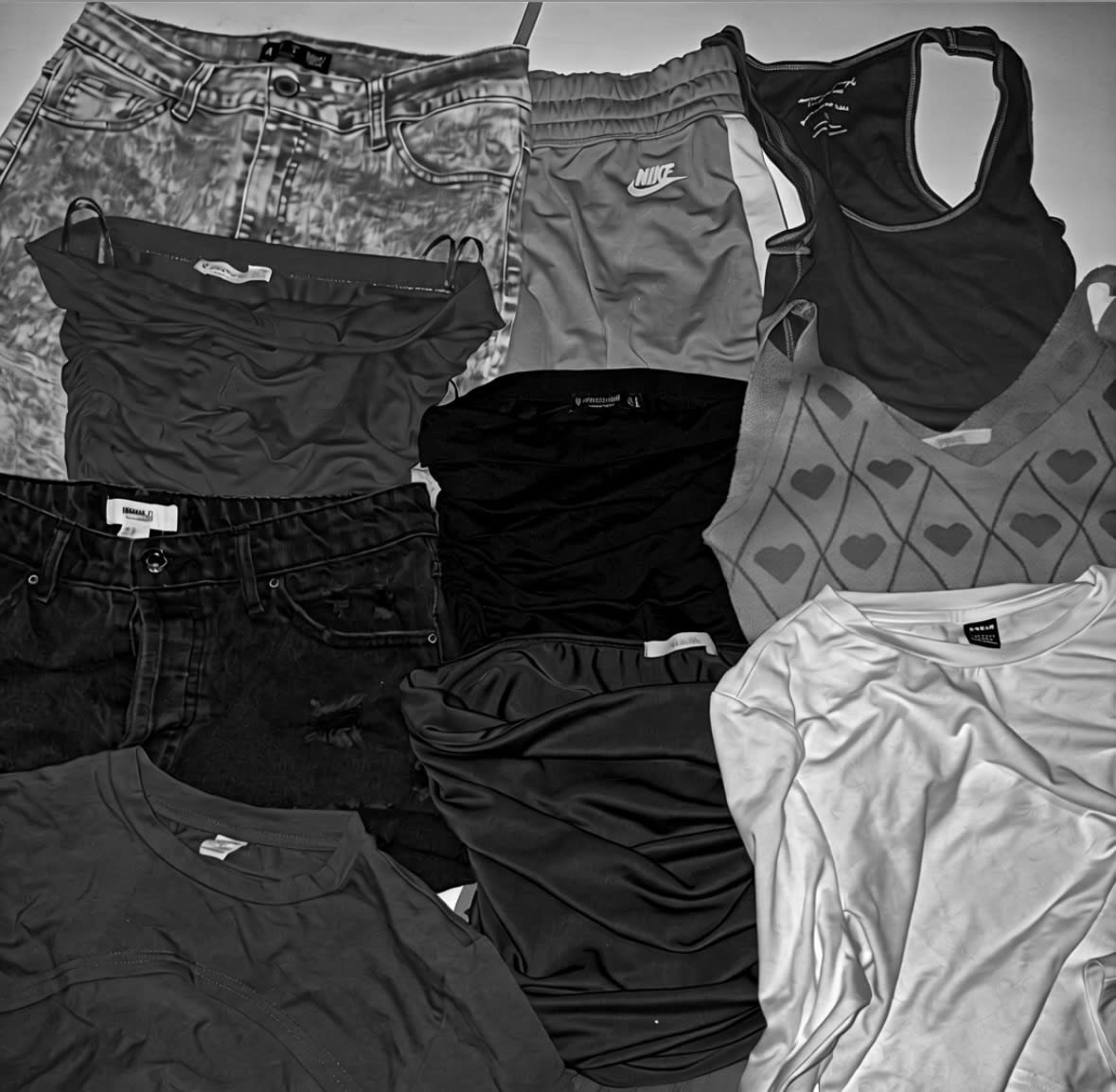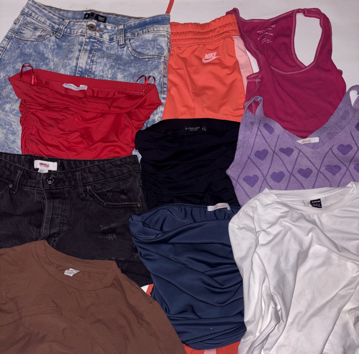 Este lote incluye 10 prendas de ropa para mujer en diferentes estilos y colores. Hay camisetas, blusas, un par de shorts y un conjunto deportivo de Nike. Las prendas están en buen estado, aunque algunas pueden mostrar signos de uso. Ideal para renovar tu guardarropa a un precio accesible.