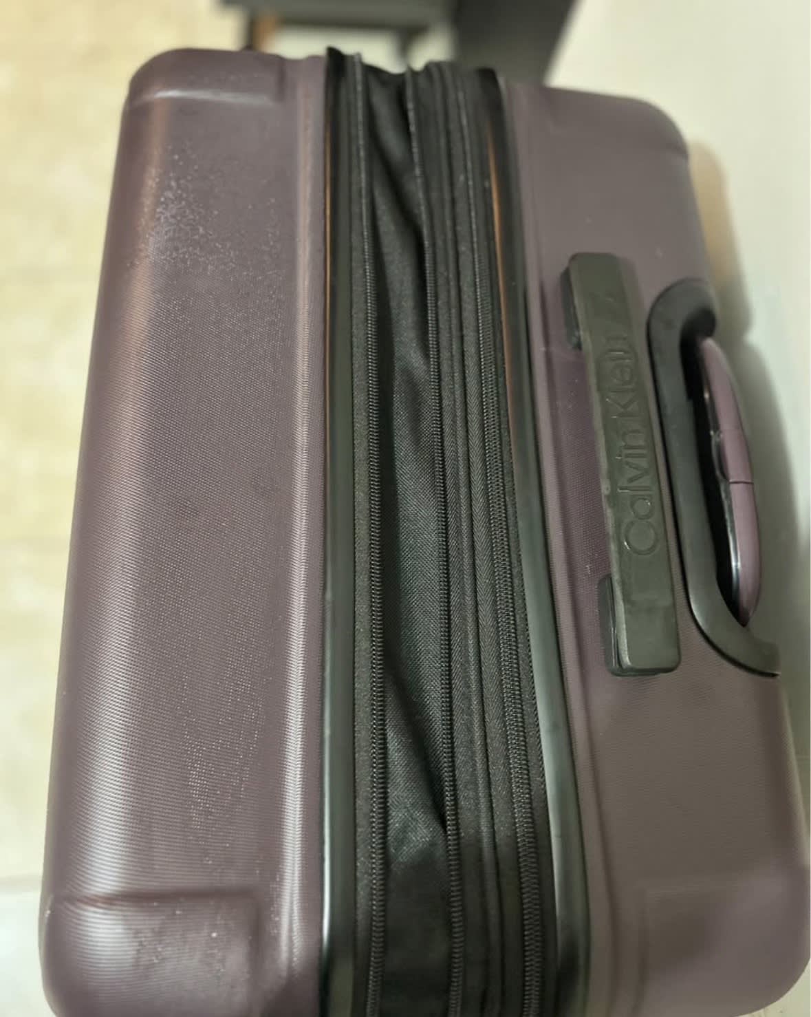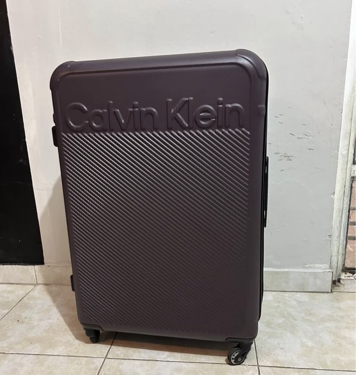 Maleta de la marca Calvin Klein, en color púrpura. Presenta algunas marcas de uso, pero en general se encuentra en buen estado. Tiene ruedas giratorias y un mango retráctil para facilitar su transporte. Cargue 32kg solo de San Diego para Guadalajara