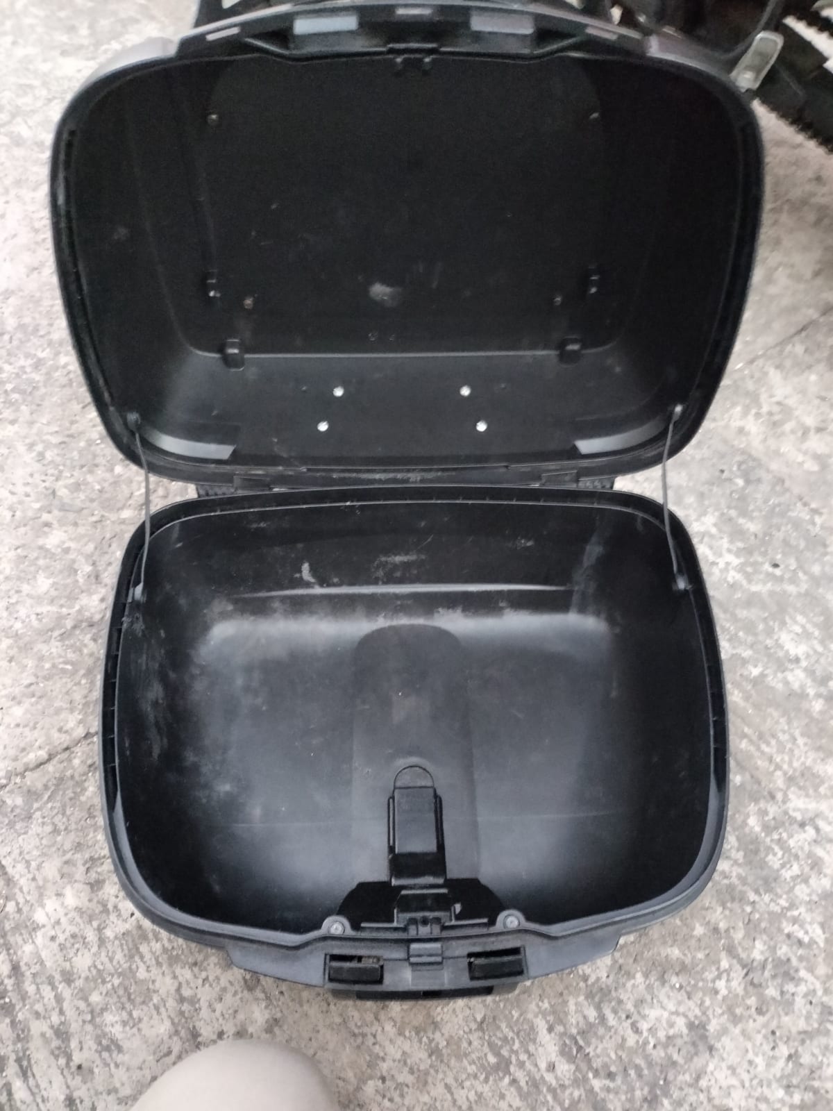 Maletero en buen estado, ideal para motocicletas. Presenta algunos rasguños visibles en la superficie, pero no afecta su funcionalidad. Incluye los ganchos de sujeción. Perfecto para llevar tus pertenencias de manera segura mientras conduces.