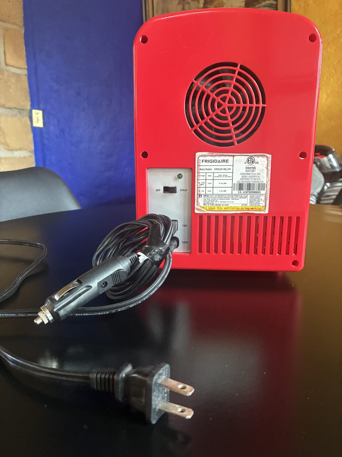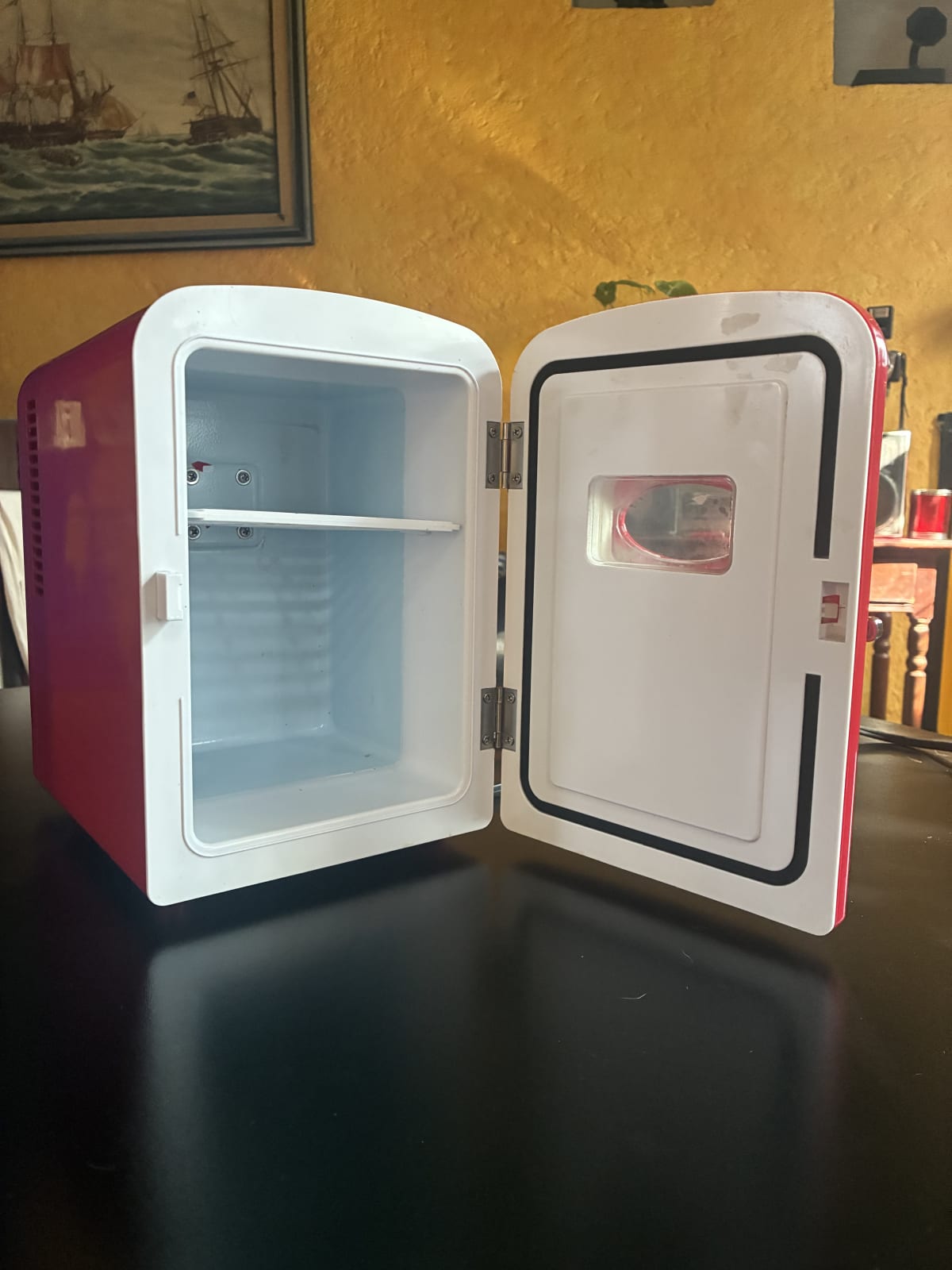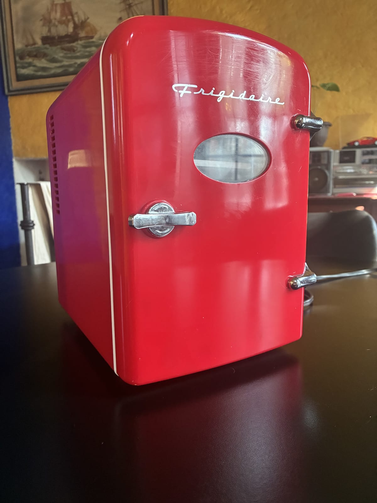 Este mini refrigerador Frigidaire de color rojo es ideal para mantener tus bebidas frías. En buen estado, con algunas marcas de uso visibles en la superficie. Incluye una repisa interna y es fácil de transportar gracias a su tamaño compacto. Funciona con corriente eléctrica y también tiene opción de conexión para auto.