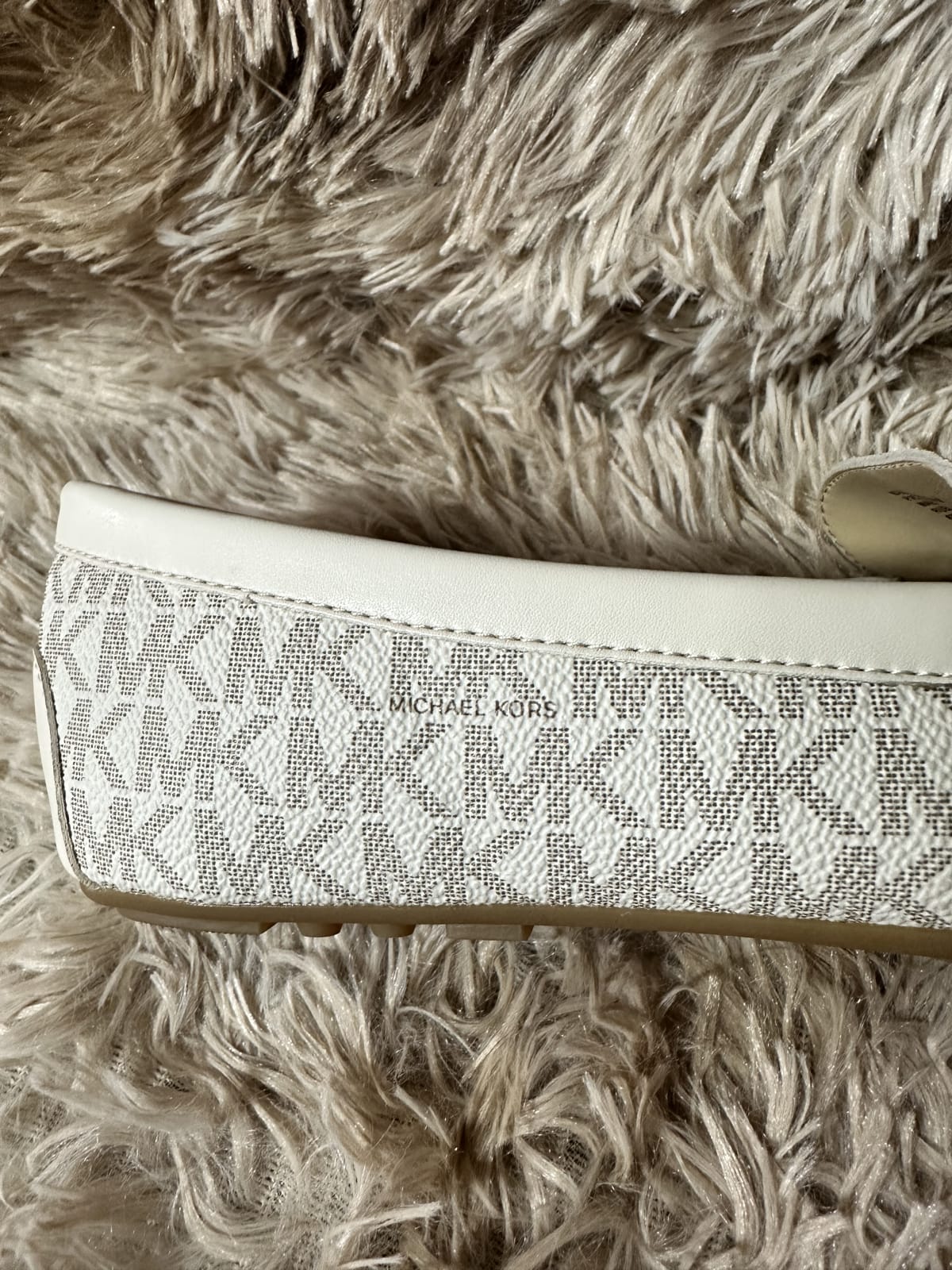 Mocasines de la marca Michael Kors en color blanco con detalles en gris. Incluyen un diseño elegante y cómodo, ideales para uso diario. Perfectos para complementar cualquier atuendo.
