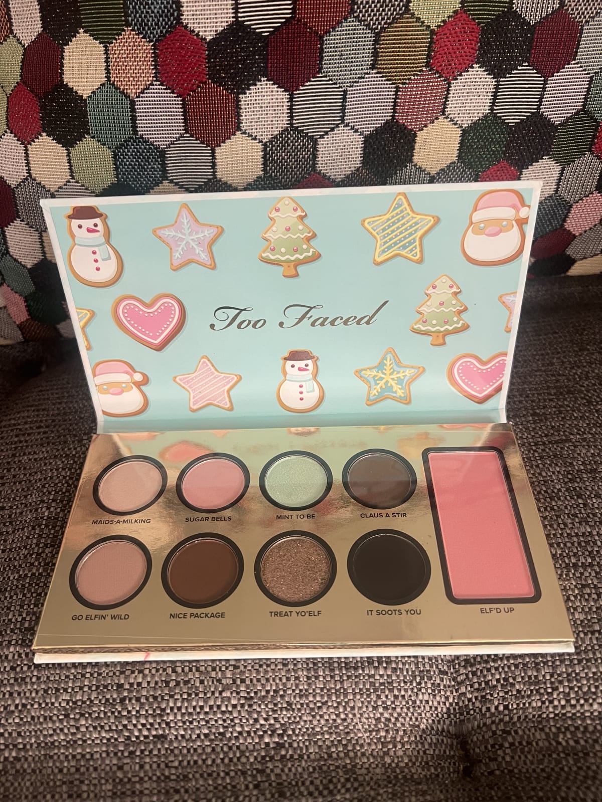 Paleta de maquillaje de la marca Too Faced, ideal para crear looks festivos. Incluye 8 sombras de ojos y 1 rubor, todos en tonos vibrantes y de buena pigmentación. La paleta es nueva Perfecta para regalar o para uso personal.