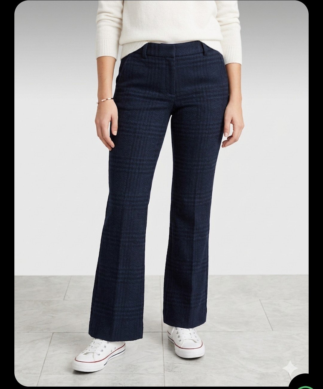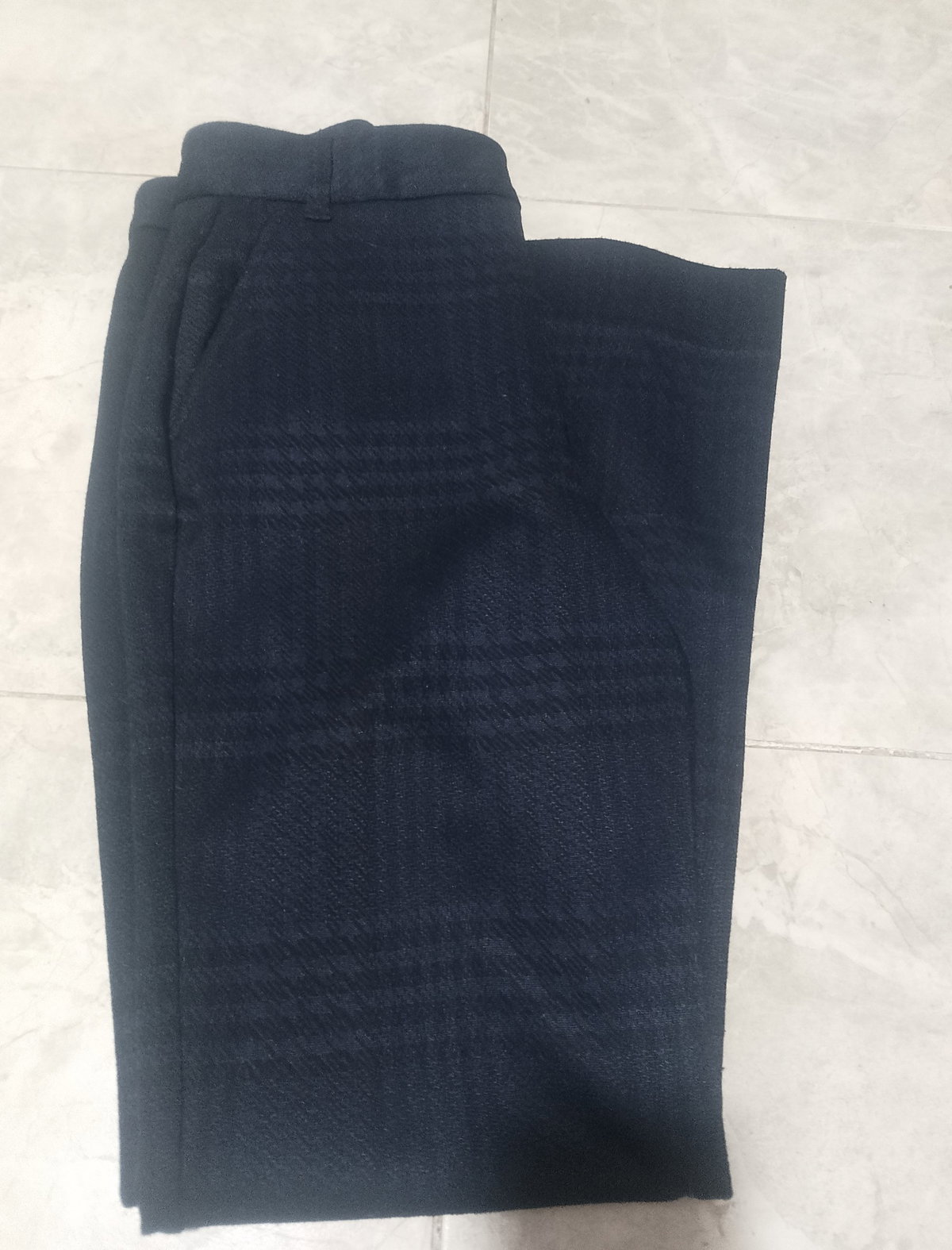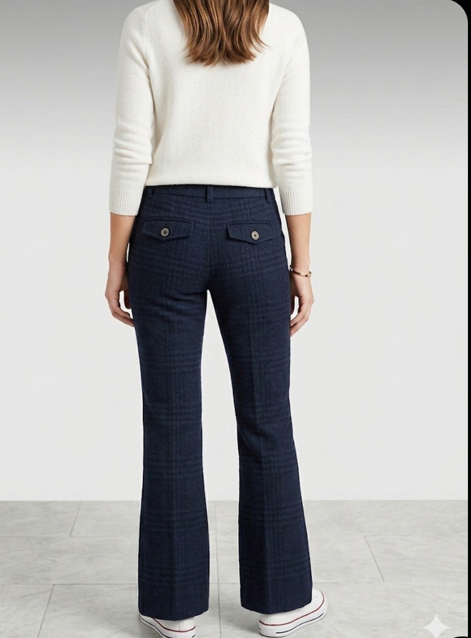 Pantalón de Vestir Corte Campana Elegante y con muy buen corte, fabricado en tela suave y elástica. Diseño clásico a cuadros en azul marino que se ve muy fino y favorecedor. Tiene bolsillos funcionales al frente y atrás. 📏 Medidas: - Cintura: 40 cm - Cadera: 51 cm - Tiro: 31 cm - Altura: 109 cm aprox talla 4
