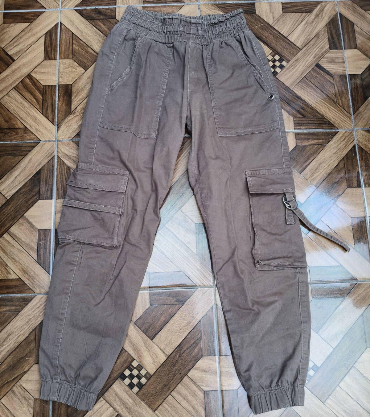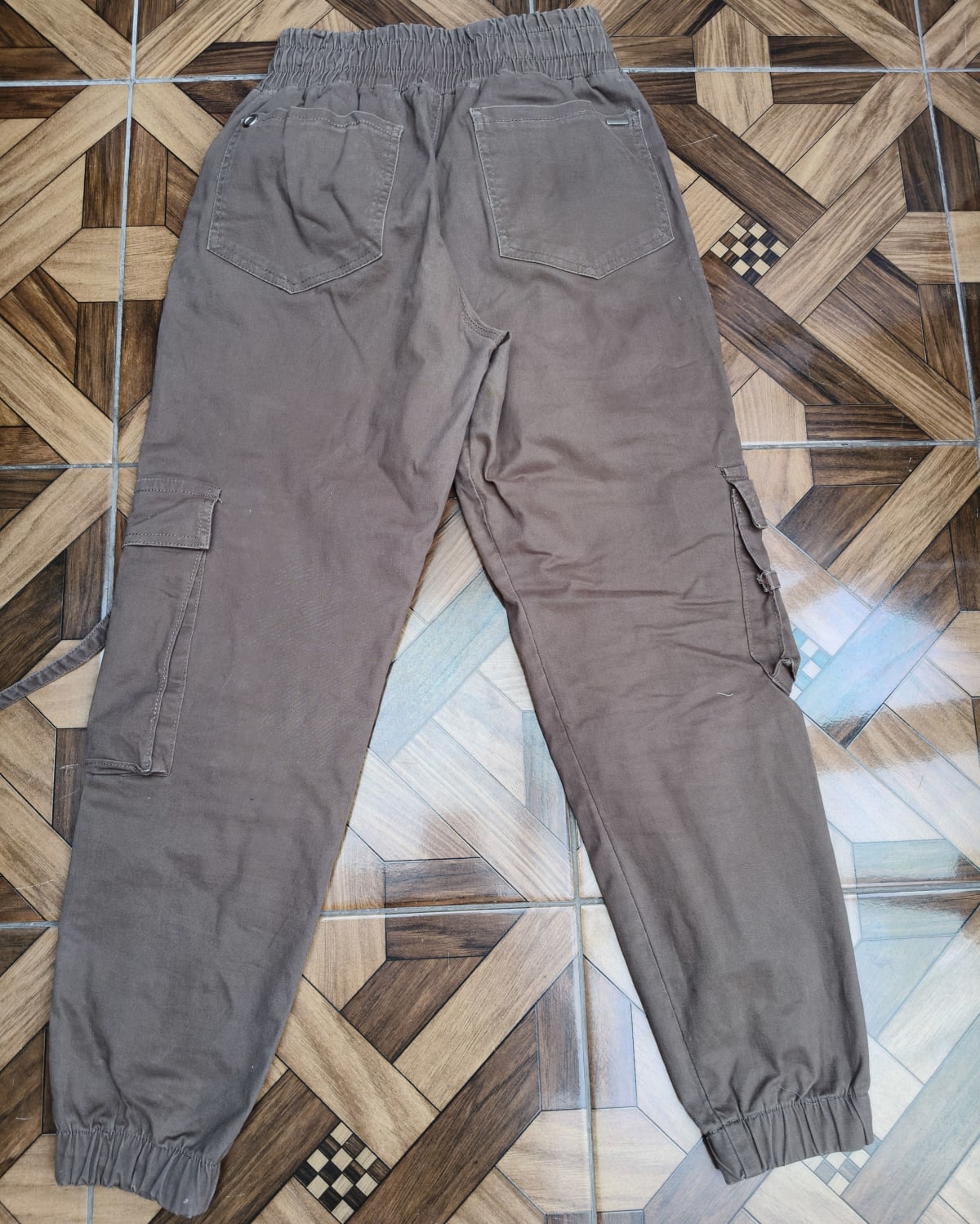 Pantalones cargo en buen estado, color marrón. Cuentan con múltiples bolsillos y cintura elástica para mayor comodidad. No presentan manchas visibles, pero tienen ligeras marcas de uso. Ideal para un look casual o actividades al aire libre.