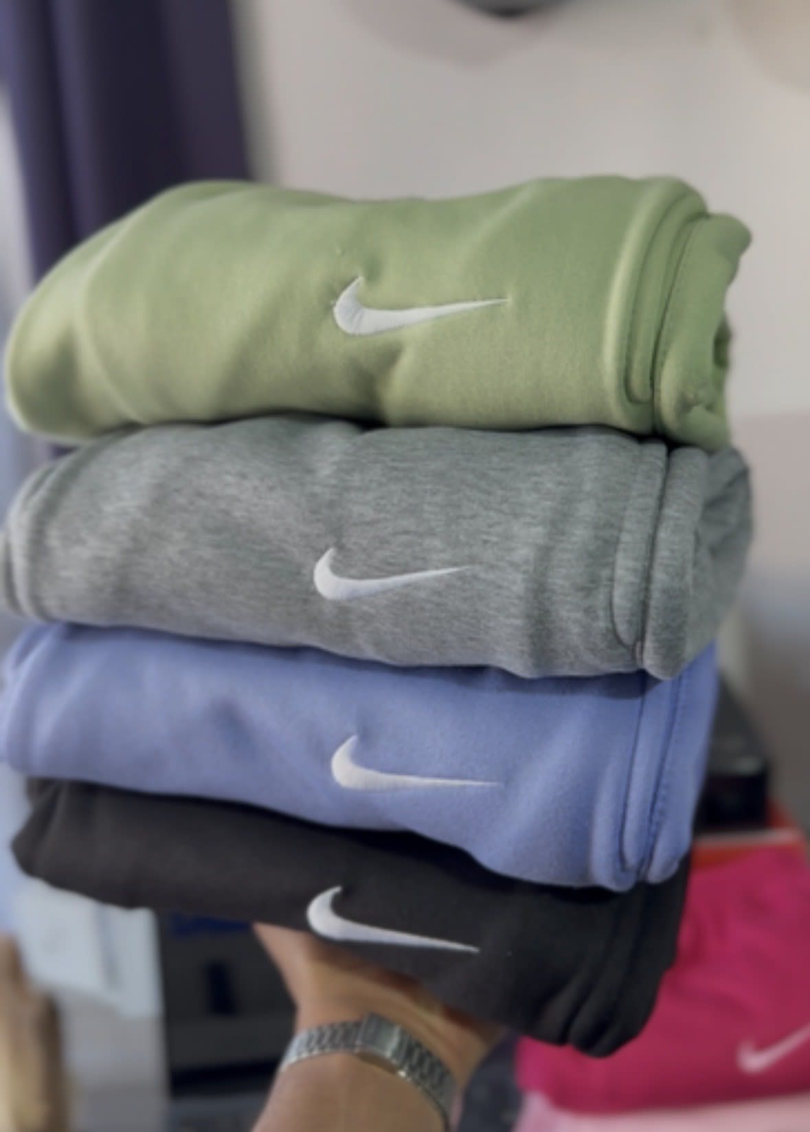 Vendo pants NIKE, nuevos con etiqueta en colores verde, gris, azul y negro, todos con el logo de Nike visible. Ideal para hacer ejercicio o uso diario. No presentan defectos visibles, están limpios y listos para usar.