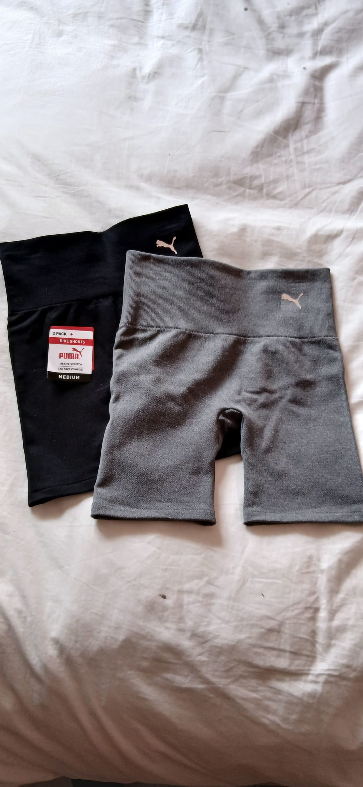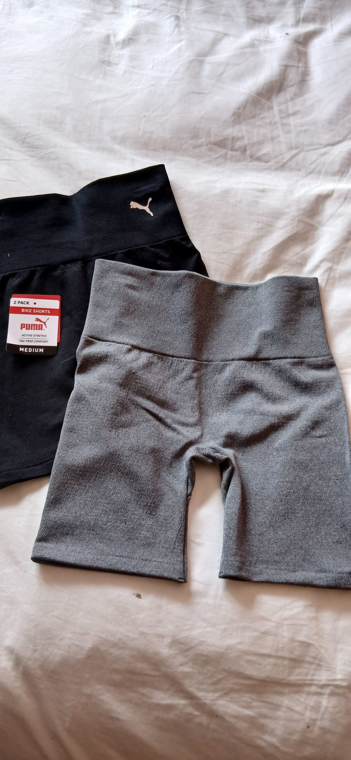 Este paquete incluye dos pantalones cortos de ciclismo de la marca Puma, uno en color negro y otro en gris. Ambos están en buen estado, con etiquetas visibles y sin defectos notables. Son ideales para actividades deportivas y ofrecen comodidad y estilo. Perfectos para quienes buscan calidad en su vestimenta deportiva.