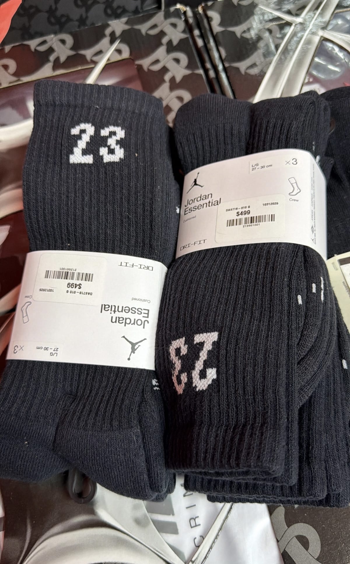 Vendo un paquete de calcetas, incluye 3 pares de calcetas Jordan Essential y 3 pares de Adidas. Todas son de color negro nuevas y originales compradas directamente en tienda con valor de $499 las Jordan y de $249 las Adidas.