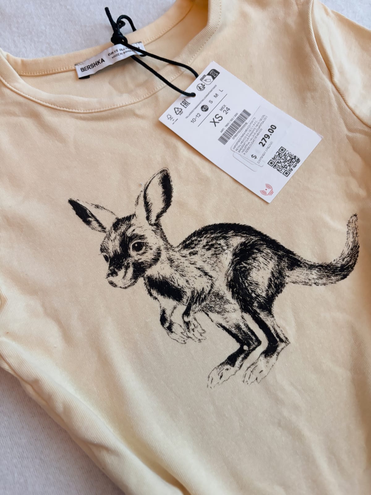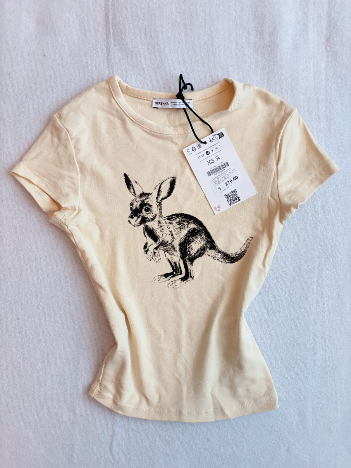 Esta playera de Bershka es de color amarillo claro y cuenta con un divertido diseño de un canguro. Está en excelente estado, con etiqueta original aún adjunta. Ideal para un look casual y fresco. Perfecta para combinar con jeans o shorts.