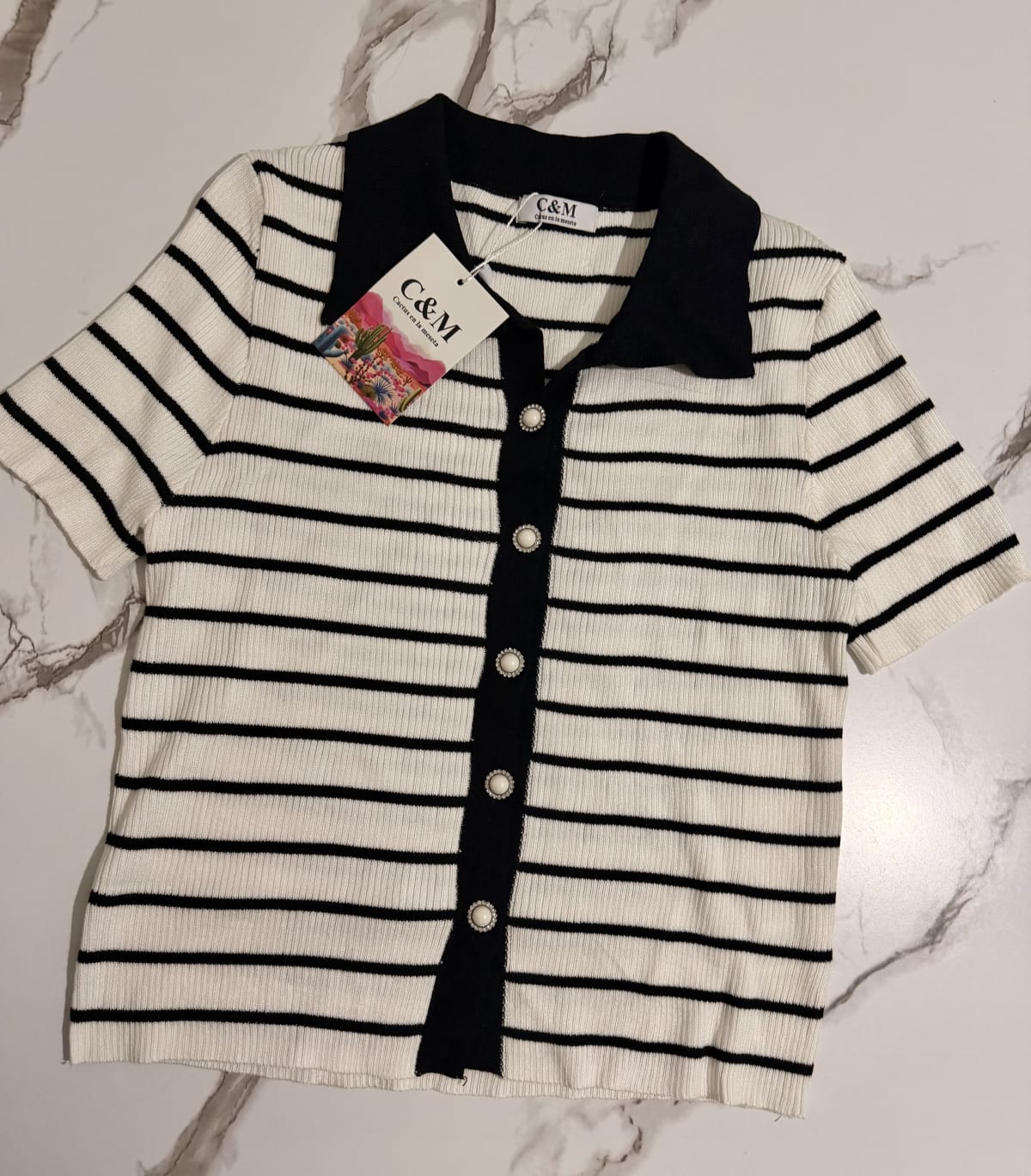 Playera de la marca C&M con diseño de rayas en blanco y negro. Tiene un cuello tipo polo y botones decorativos en la parte delantera. La prenda está en buen estado, sin defectos visibles y con la etiqueta original aún puesta.