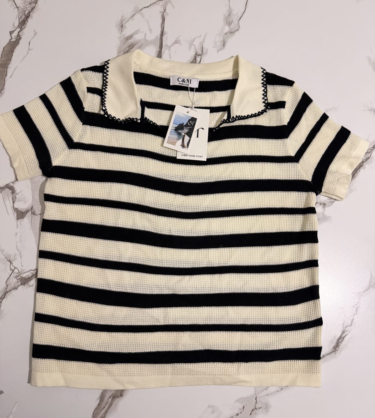 Playera de rayas en tonos crema y negro, con cuello tipo polo. Se encuentra en buen estado, con etiqueta original aún visible. Ideal para un look casual y fresco. Sin defectos visibles.