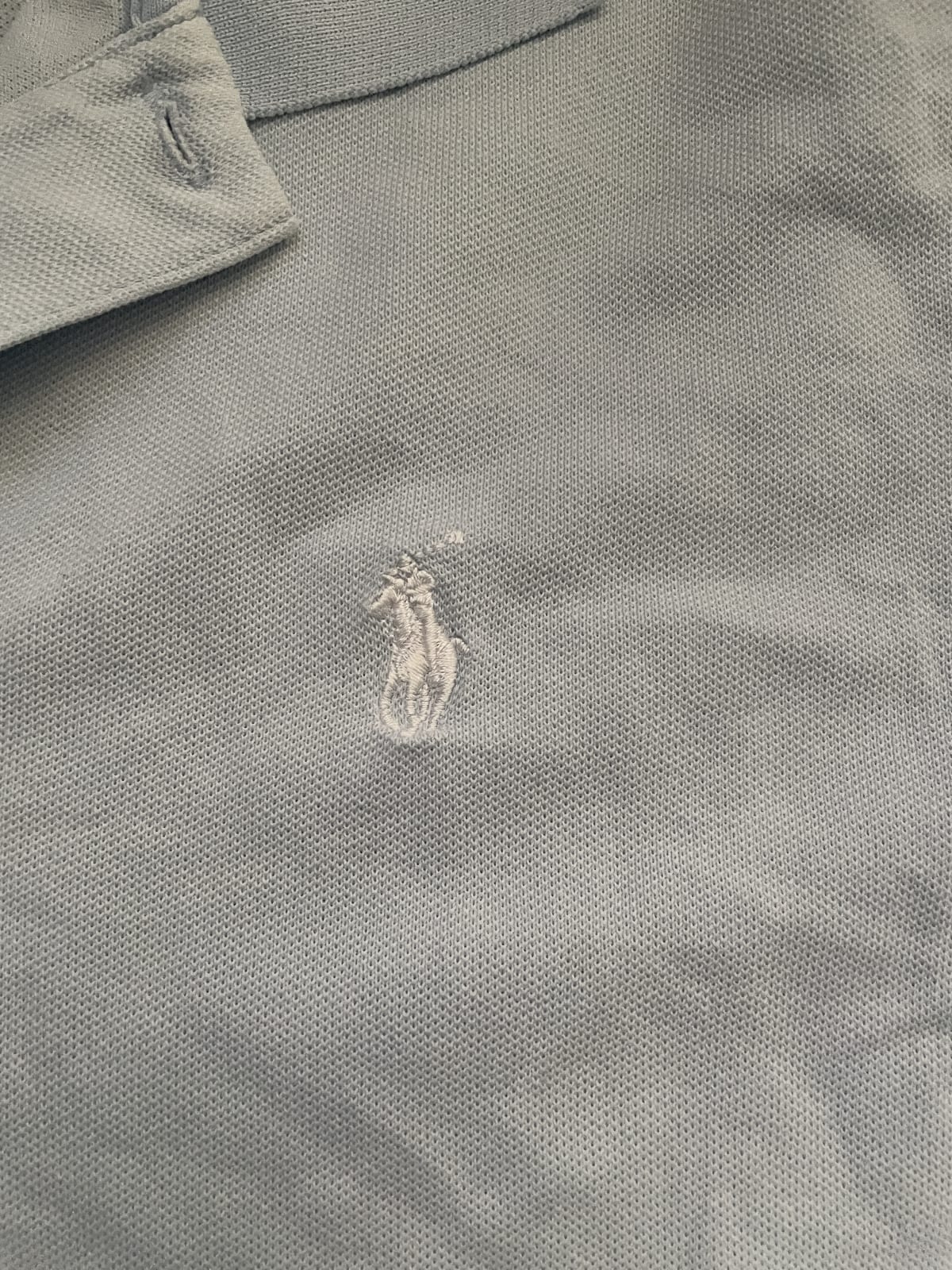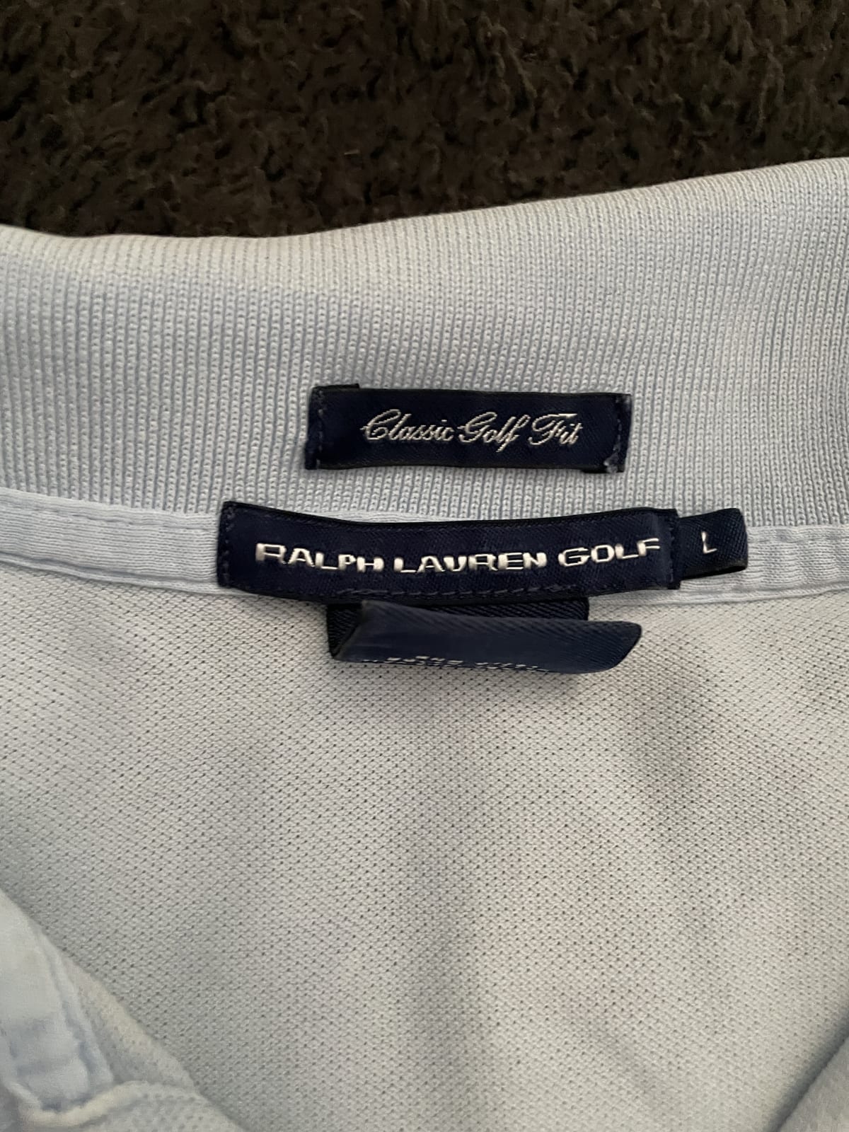 Playera polo de Ralph Lauren Golf en color azul claro, talla L. Presenta un diseño clásico con el logo bordado en el pecho. La prenda está en buen estado, aunque tiene algunas arrugas visibles. Ideal para uso casual o actividades deportivas.