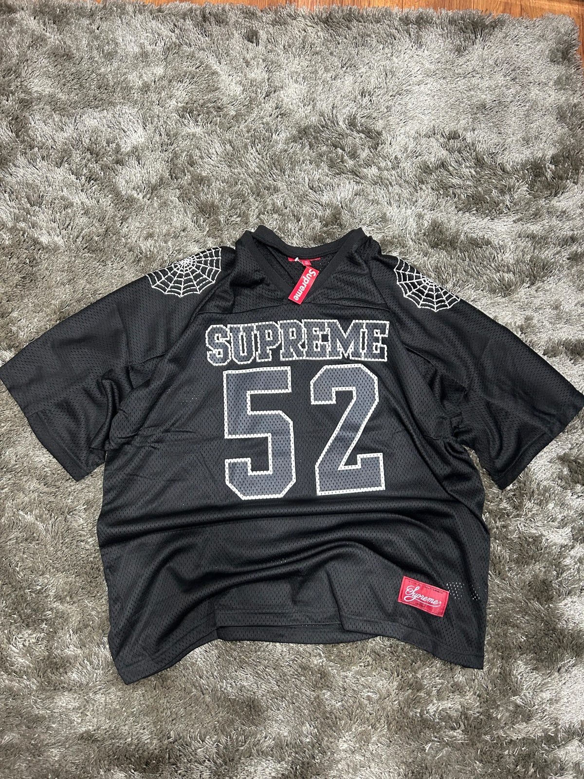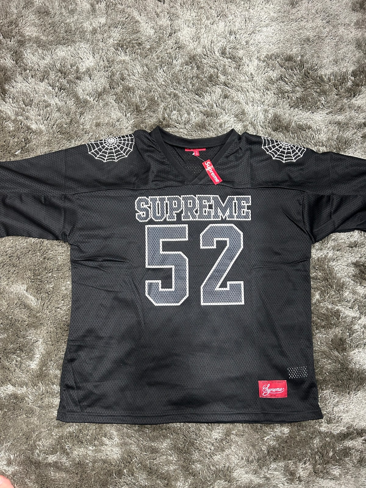 Playera de la marca Supreme en color negro, con el número 52 y un diseño de telaraña en las mangas. La prenda es nueva, aún con etiqueta. Está hecha de 100% poliéster, ideal para un look urbano. Perfecta para los fanáticos de la moda streetwear.