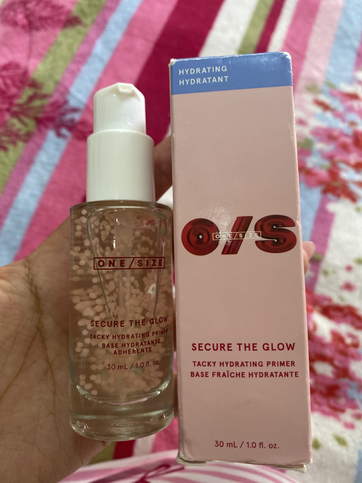 Vendo primer hidratante One/Size Secure The Glow de 30 ml. Este producto es ideal para preparar la piel antes del maquillaje, proporcionando hidratación durante todo el día. El frasco está en buen estado, aunque la caja presenta algunos rasguños visibles. Incluye su empaque original.