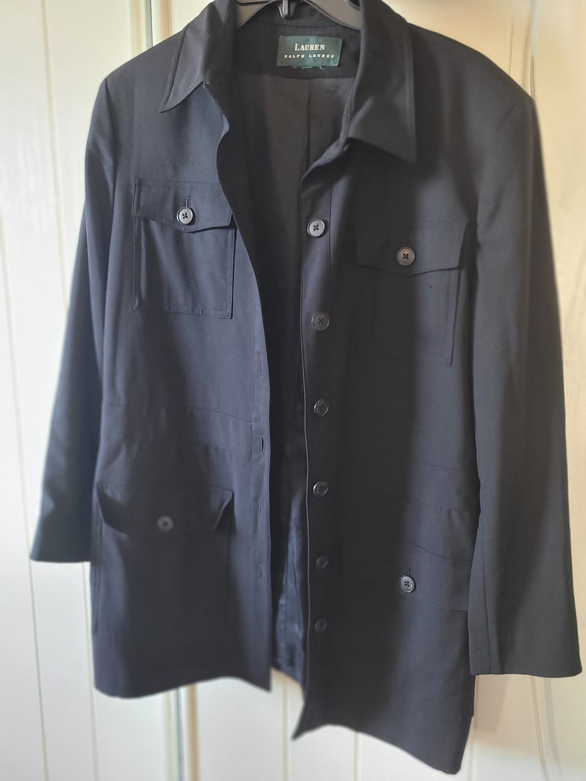 Chamarra de la marca Ralph Lauren en color negro, en buen estado. Cuenta con cuatro bolsillos frontales y botones en la parte delantera. Ideal para uso casual o formal. Sin defectos visibles.